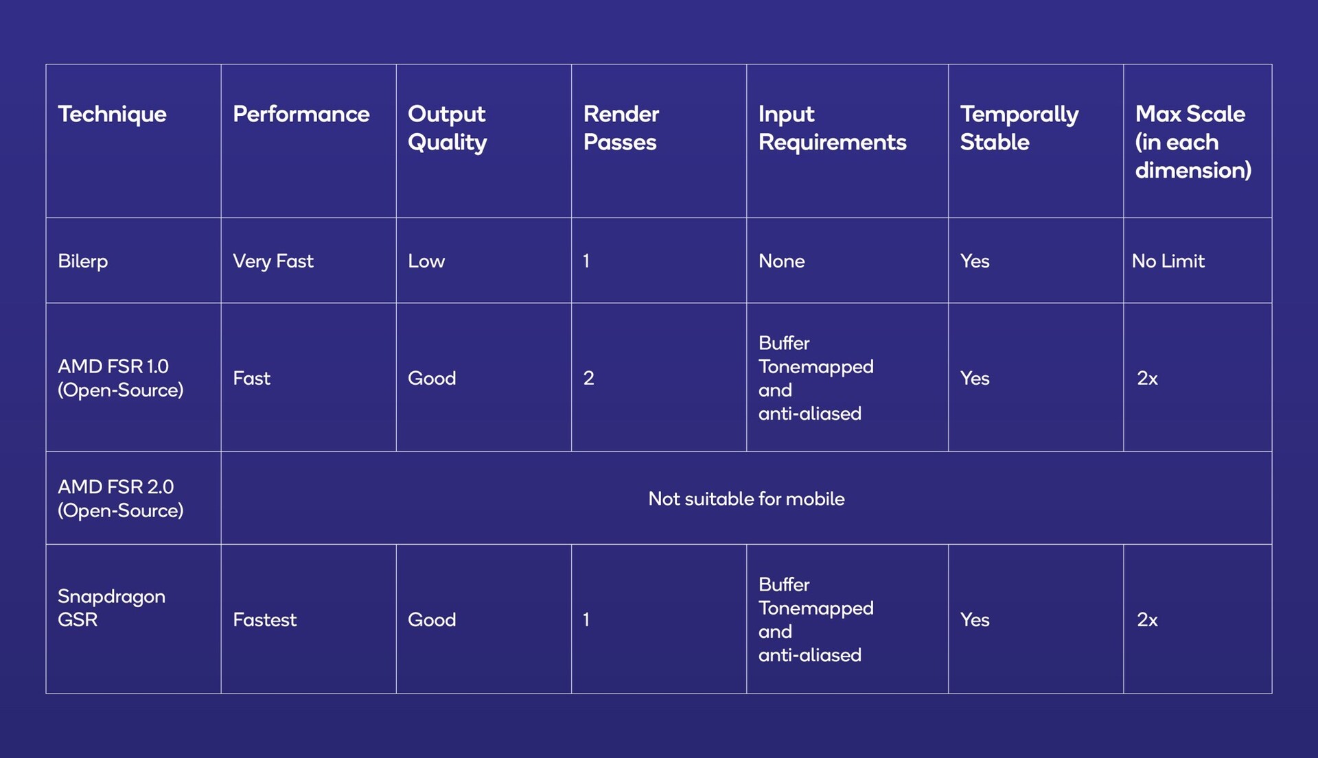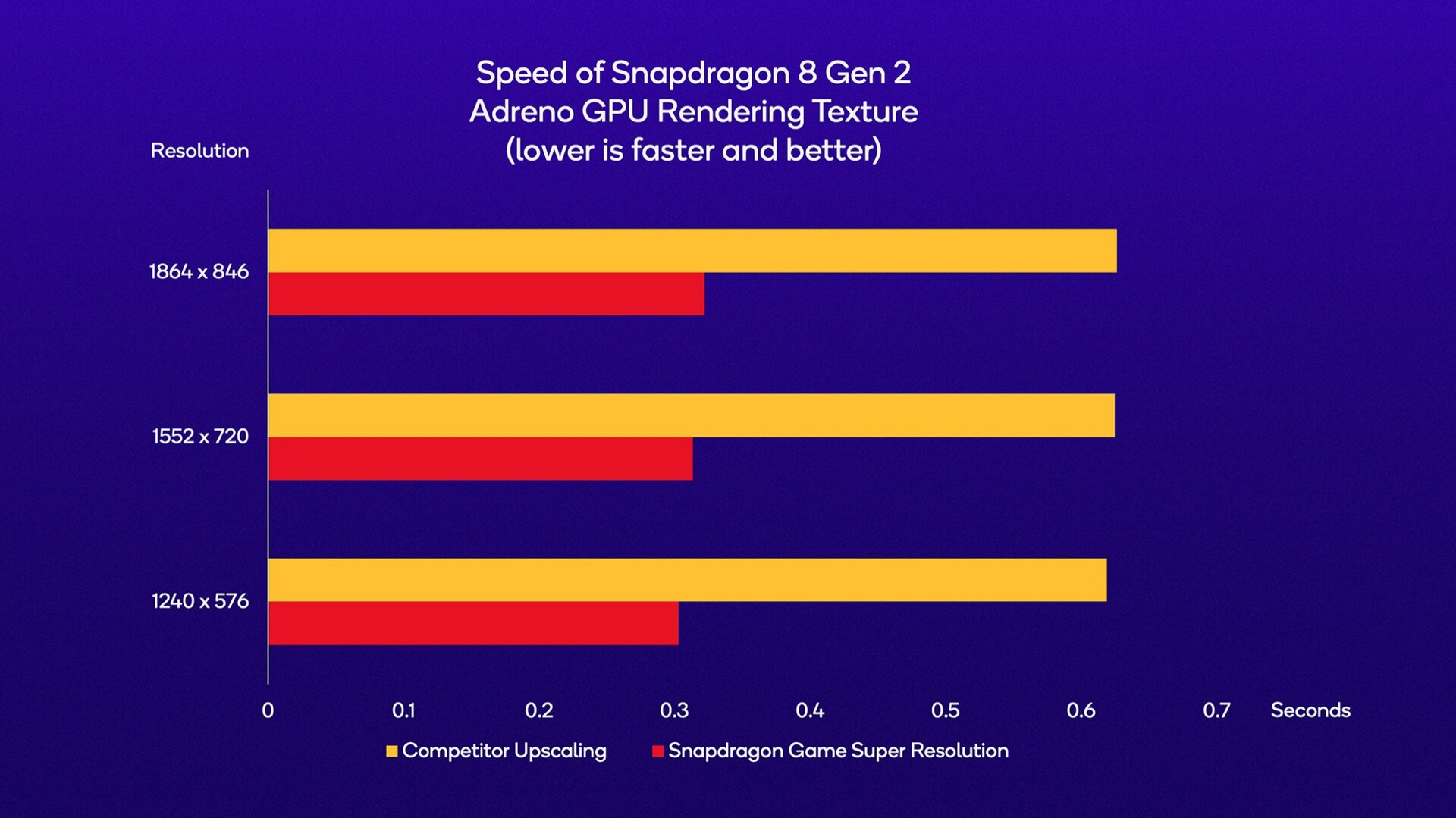 In der Praxis soll GSR eine etwas höhere Performance und eine vergleichbare Bildqualität wie AMD FSR 1 erzielen, mit FSR 2 oder gar Nvidia DLSS 3.0 wagt Qualcomm keinen Vergleich. In jedem Fall kann GSR die Auflösung auf jeder Achse verdoppeln, sprich aus 540p wird 1.080p, aus 1.080p wird 4K. Die Bildrate kann dadurch theoretisch mehr als verdoppelt werden.