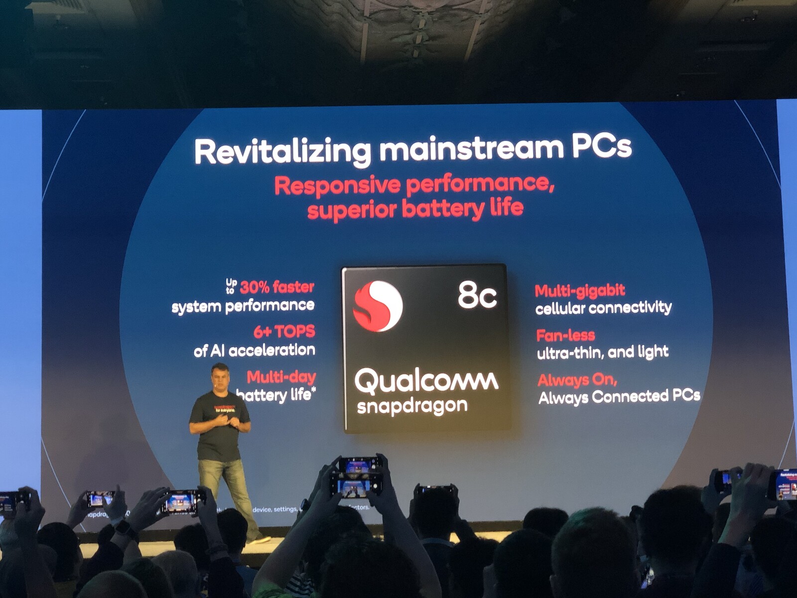 Der im 7-nm-Prozess gefertigte Snapdragon 8c bietet bis zu 30% mehr Leistung als der Snapdragon 850 und 6 TOPS an KI-Leistung. Der Snapdragon 8c verfügt über eine Kryo 490 CPU mit bis zu 2,45 GHz, einen Adreno 675 Grafikprozessor und integriert das Snapdragon X24 LTE Modem. OEMs haben die Wahl, den Snapdragon 8c SoC auch mit einem Snapdragon X55 5G Modem zu kombinieren.