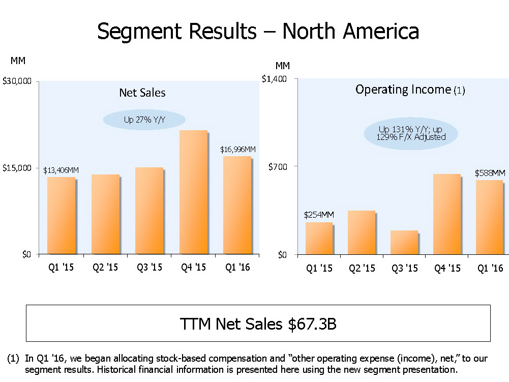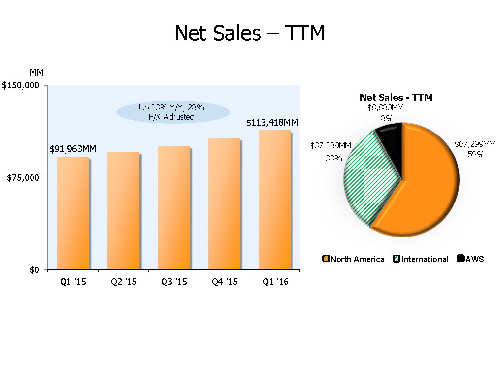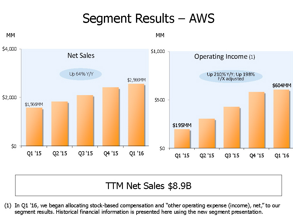 Neben dem US-Handelsgeschäft erwies sich vor allem der Geschäftsbereich Amazon Web Services (AWS) als Gelddruckmaschine. Das internationale Versandgeschäft sorgte hingegen unter dem Strich für eine operativen Verlust von 121 Millionen US-Dollar, bei einem Umsatz von 9,566 Milliarden Dollar. In Nordamerika steigerte Amazon den Umsatz im Handelsgeschäft auf 16,996 Mrd. Dollar, nach 13,406 Mrd. in Q1/2015. Der operative Gewinn betrug hier 588 Mio. Dollar (Q1/2015: 254 Mio. $). Der Cloud-Bereich AWS steuerte einen Umsatz von 2,566 Mrd. sowie einen Gewinn (operativ) von 604 Mio. Dollar bei.