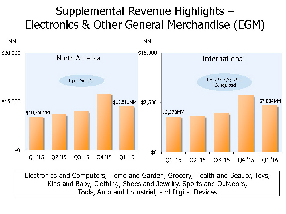 Auch die Erlöse bei Büchern, digitalen Downloads, Filmen, Konsolen, Musik, Software und Videospielen legten bei Amazon kräftig zu. In Nordamerika auf 3,208 Mrd. Dollar und international auf 2,480 Milliarden. Noch deutlicher wuchsen die Erlöse im Handelsgeschäft EGM (Electronics & Other General Merchandise). Hier kann Amazon.com in den aktuellen Geschäftszahlen für Nordamerika 13,511 Mrd. und international 7,034 Mrd. Dollar ausweisen.
