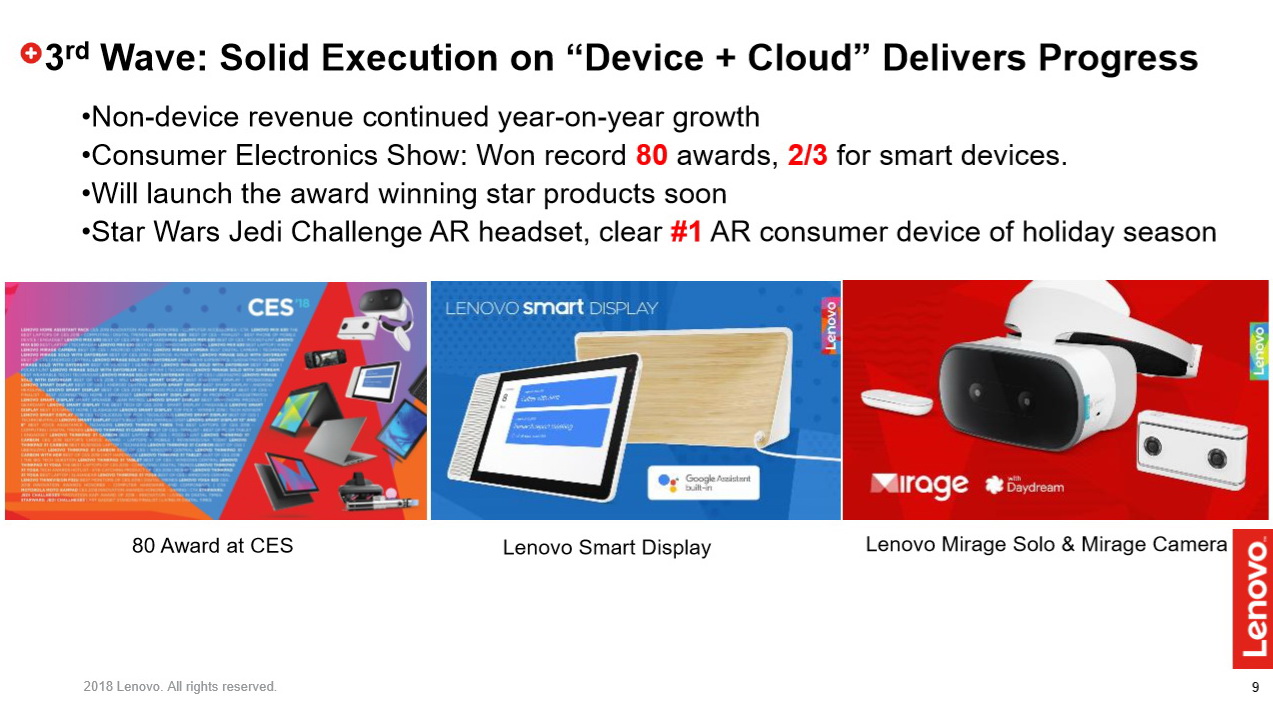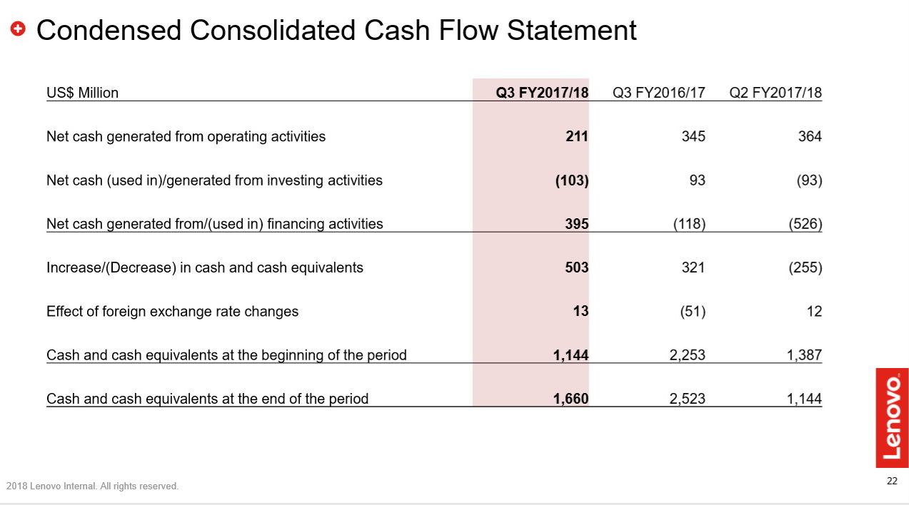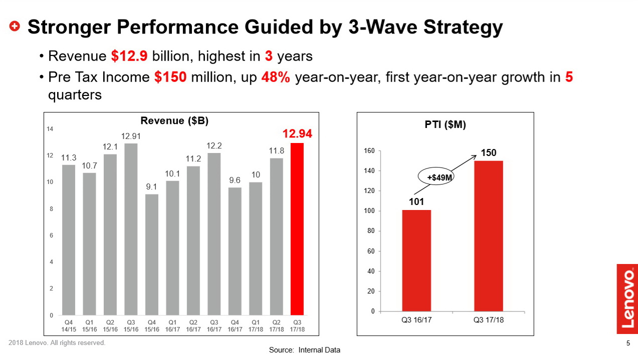 Bei den Geschäftszahlen für die abgelaufenen neun Monate im aktuellen Fiskaljahr 2017/2018 steigerte Lenovo den Umsatz von 33,456 Mrd. auf 34,712 Milliarden Dollar. Im Gegenzug schrumpfte der operative Gewinn von Lenovo von 598 Millionen auf 286 Mio. Dollar. Unter dem Strich muss Lenovo einen bislang aufgelaufenen Nettoverlust von 222 Millionen US-Dollar verbuchen. Ein Jahr zuvor konnte Lenovo hier noch einen Nettogewinn von 428 Mio. Dollar ausweisen.
