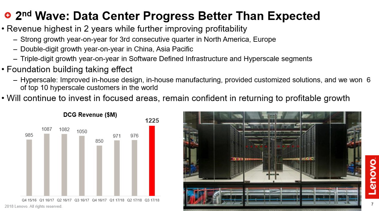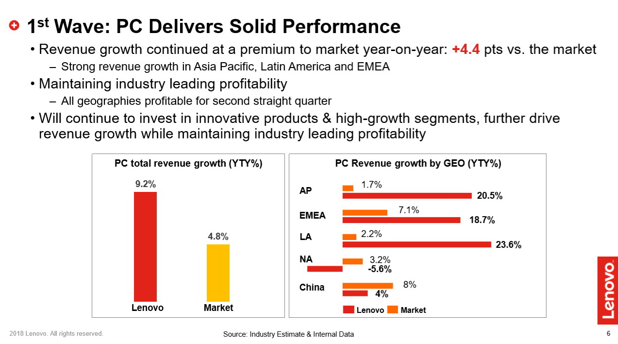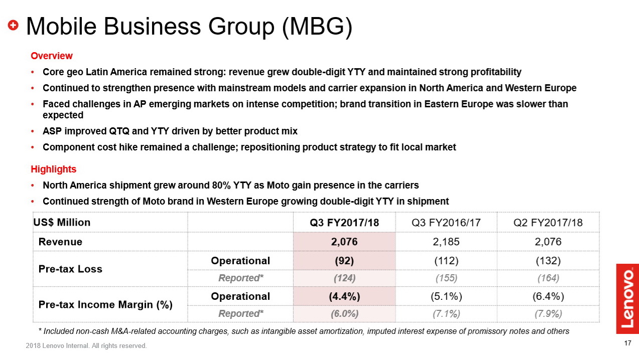 Während das PC-Geschäft (PCSD) von Lenovo mehr Umsatz bei leicht gesunkenen Erträgen in die Kassen von Lenovo spülte, sorgten die Geschäftsbereiche Data-Center (DCG) und das Geschäft mit Smartphones (MBG) im dritten Quartal des FY 2017/2018 in der Bilanz von Lenovo für Verluste. Gut liefen die Geschäfte für Lenovo nur in China. Dort erwirtschaftete Lenovo Erträge in Höhe von 204 Millionen US-Dollar, in den Absatzregionen Asien-Pazifik (-60 Mio. US-$) und EMEA (-11 Mio. US-$) hingegen Verluste.