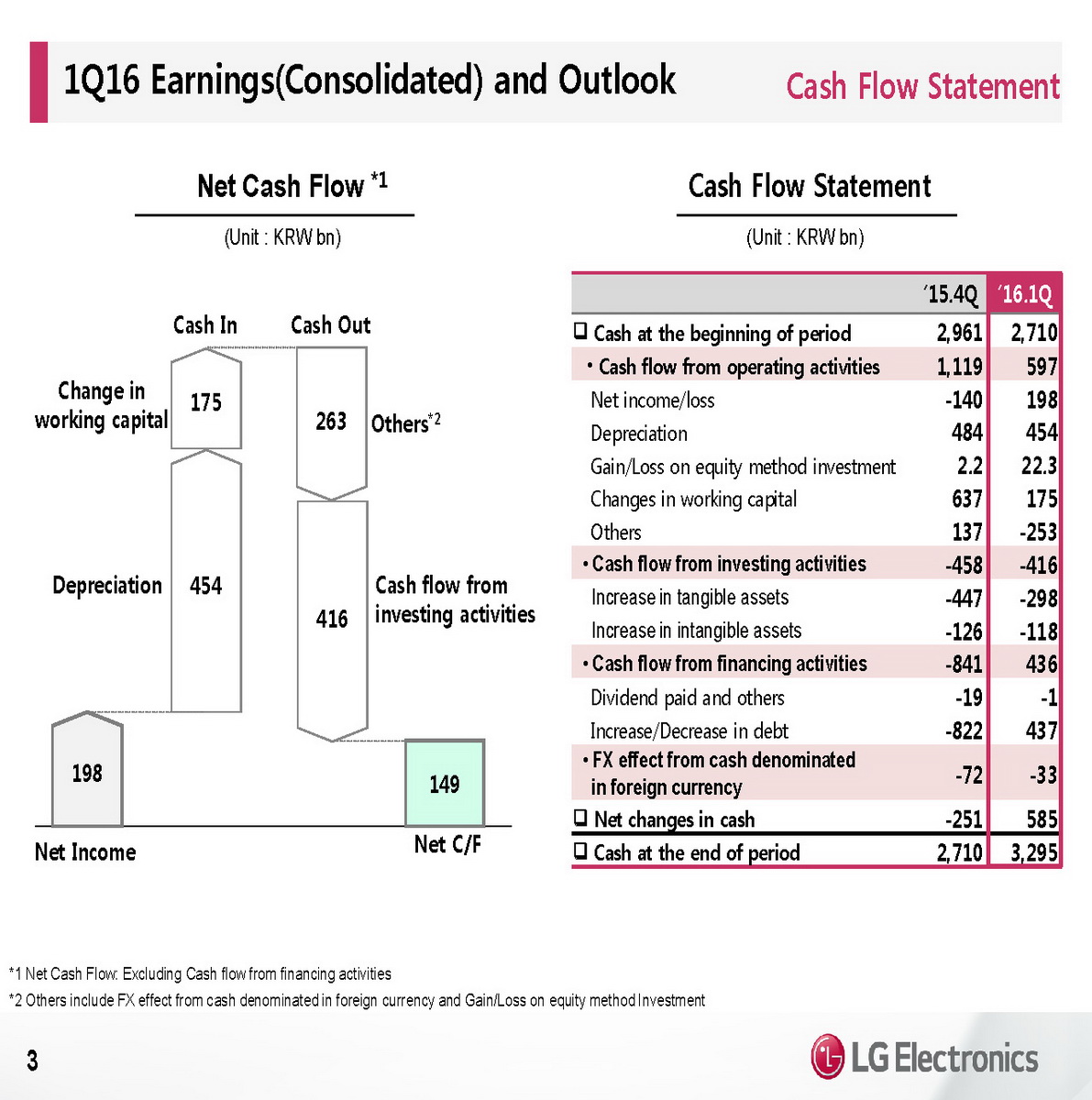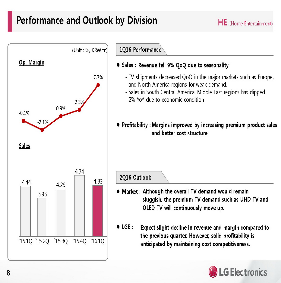 Umsatzträger und verantwortlich für den Gewinnsprung waren die Geschäftsbereiche Home Appliance & Air Solution sowie Home Entertainment von LG. Der Bereich Mobile Communications mit den Smartphones sorgte für einen dicken Verlust in der LG-Bilanz. Und auch für die Fahrzeugkomponenten (Vehicle Components) steht in Q1/2016 unter dem Strich ein Minus. Für die LG Home Appliance & Air Solution meldet der Konzern aus Korea in Q1/2016 einen operativen Gewinn von 407,8 Mrd. Won (339,23 Mio. US-Dollar) und für die LG Home Entertainment 335,2 Mrd. Won (278,84 Mio. Dollar).