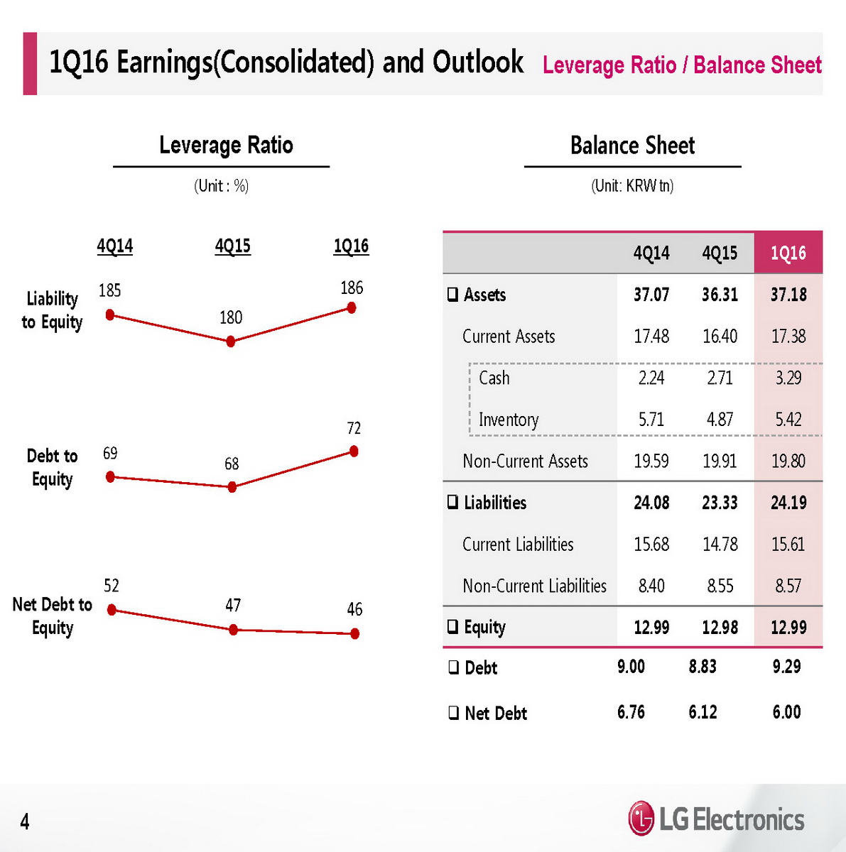 Der südkoreanische Haushalts- und Unterhaltungselektronikhersteller LG Electronics (LG) hat seine Geschäftszahlen für das 1. Quartal 2016 bekannt gegeben. LG meldete für Q1/2016 im Vergleich zum gleichen Zeitraum in 2015 einen deutlichen Gewinnanstieg, bei etwas weniger Umsatz. Der operative Gewinn von LG kletterte um 65,5 Prozent, von 305,2 auf 505,2 Milliarden Won (420,25 Mio. US-Dollar). Der Umsatz lag bei 13,362 Billionen Won (11,12 Mrd. US-Dollar). In Q1/2015 lag der Umsatz des LG-Konzerns noch bei 13,994 Billionen.