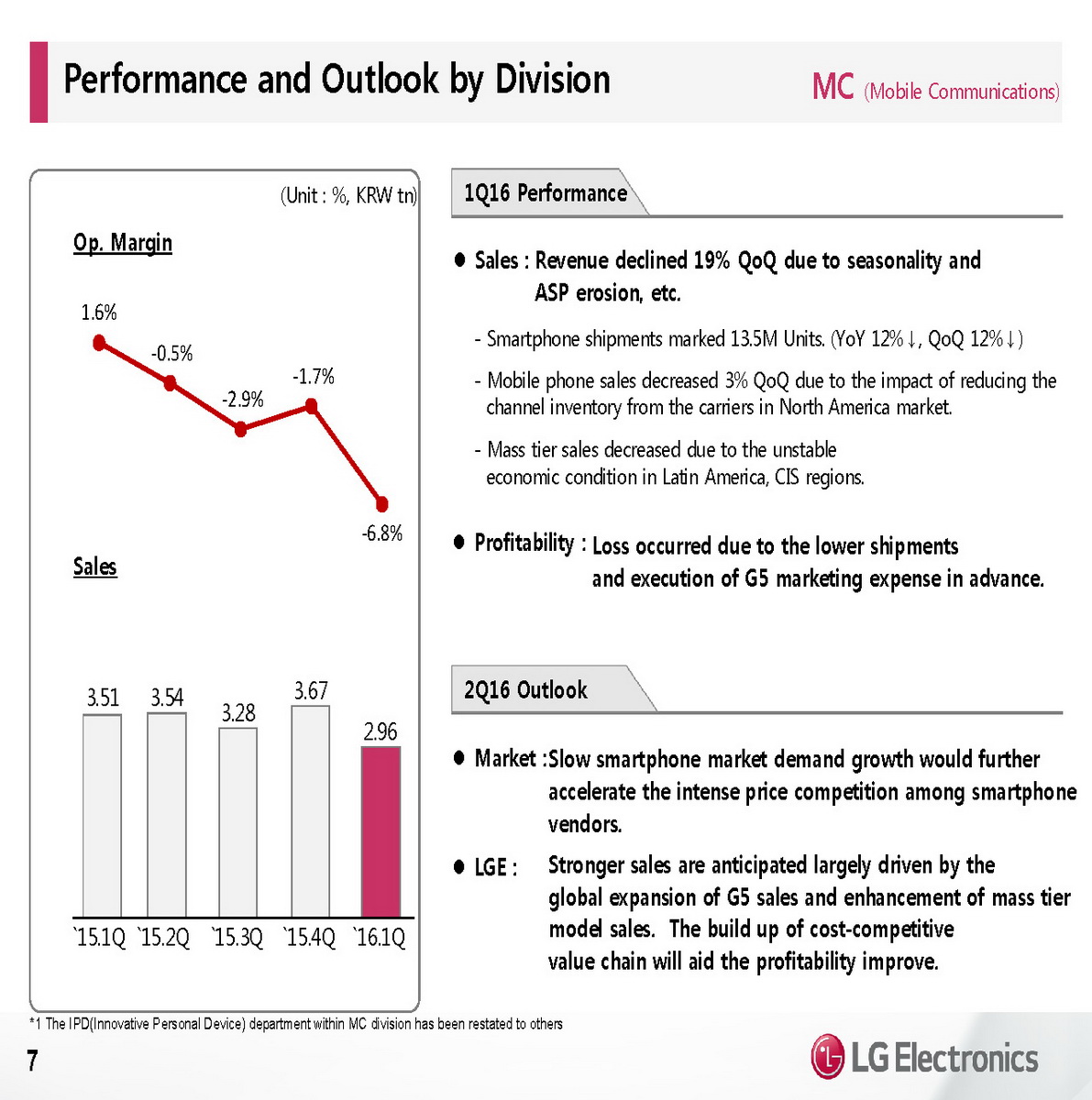 Die LG Mobile Communications steuerte mit 2,963 Billionen Won (2,46 Mrd. US-Dollar) einen deutlich geschrumpften Quartalsumsatz bei. Dies entspricht einem Umsatzrückgang von 15,5 Prozent. In Q1/2015 betrug der Umsatz in diesem Unternehmensbereich von LG noch 3,508 Billionen Won. Insgesamt konnte LG im 1. Quartal 2016 nur noch 13,5 Millionen Smartphones absetzen. Das entspricht einem Minus von 12 Prozent (Y-o-Y und Q-o-Q). Für seinen Smartphone-Bereich weist LG in der Bilanz für Q1/2016 nun einen operativen Verlust von 202,2 Mrd. Won aus.