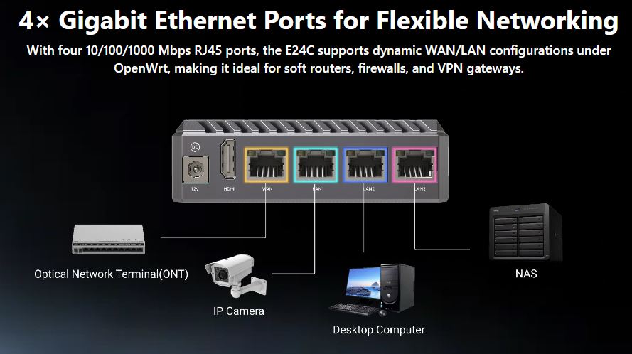 Der E24C kann im Prinzip auch als Mini-PC genutzt werden, beworben wird die Kompatibilität zur Debian-Version Radxa OS, aber auch zu Flippy OpenWrt - für Netzwerkanbindungen dürfte sich das System auch gut eignen, da es vier einzelne Ethernet-Anschlüsse mit Gigabit-Geschwindigkeit mitbringt. Es steht einmal HDMI 2.1 auch zur Ausgabe von 4K-Material bereit. Auf der Platine ist noch ein Anschluss für einen Lüfter zu finden, aber auch für eine Batterie für die Echtzeituhr. Sensoren und Aktoren lassen sich unter anderem über SPI und I2C anschließen. Mit elektrischer Energie wird das Modell mittels Rundstecker und mit einer Spannung von 12 Volt. Es stehen einmal USB 2.0 im Typ C und dreimal im Typ A bereit. Erhältlich ist das System über AliExpress für einen Preis von knapp 38 Euro zuzüglich Versandkosten in Höhe von knapp 12 Euro.
