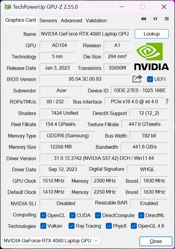| Acer Predator Helios 18 N23Q2 AUO45A8 (B180QAN01.2), IPS, 2560x1600, 18" | MSI GE78HX 13VH-070US AU Optronics B170QAN01.2, IPS, 2560x1600, 17" | HP Omen 17-ck2097ng BOE BOE09BF, IPS, 2560x1440, 17.3" | Alienware m18 R1 Chi Mei 180JME, IPS, 1920x1200, 18" | Asus ROG Strix G18 G814JI NE180QDM-NZ2 (BOE0B35), IPS, 2560x1600, 18" | Razer Blade 18 RTX 4070 AU Optronics B180QAN01.0, IPS, 2560x1600, 18" | |