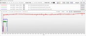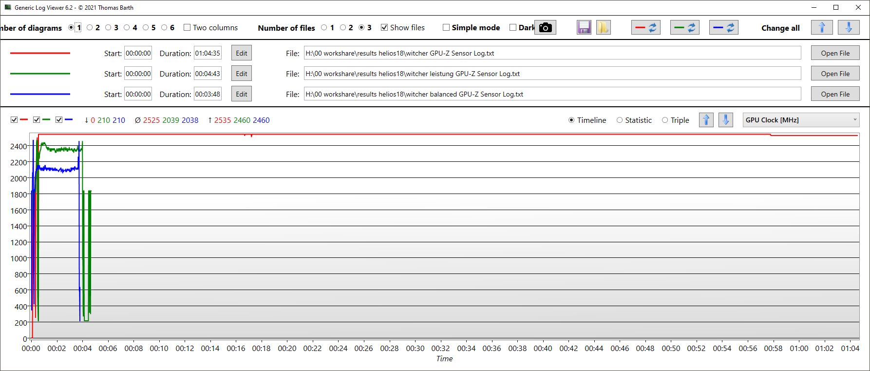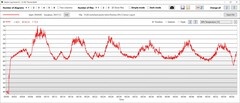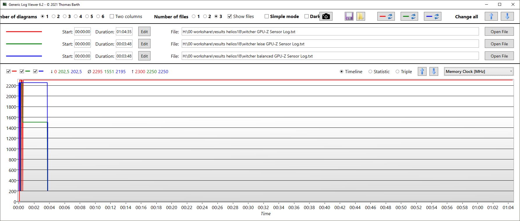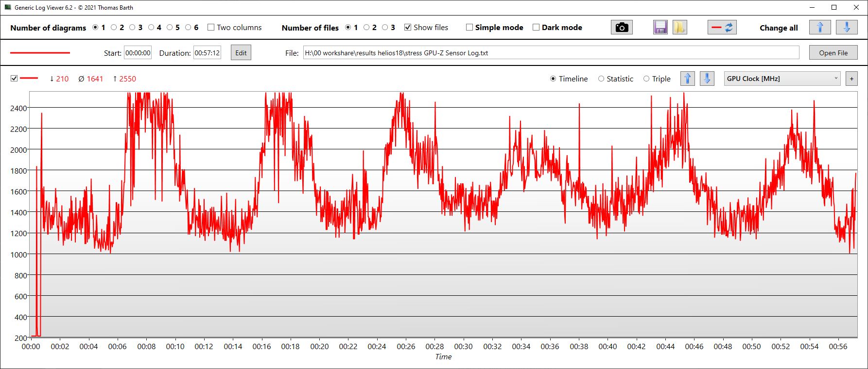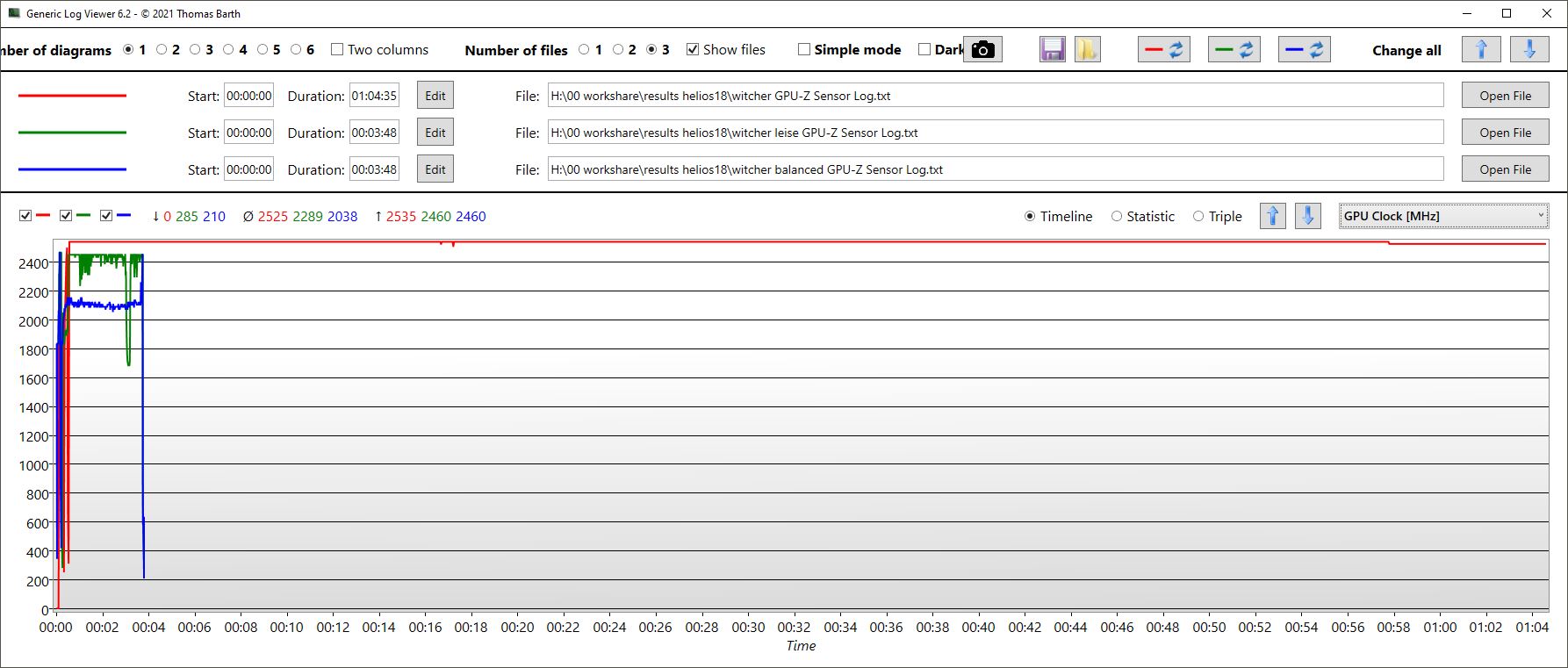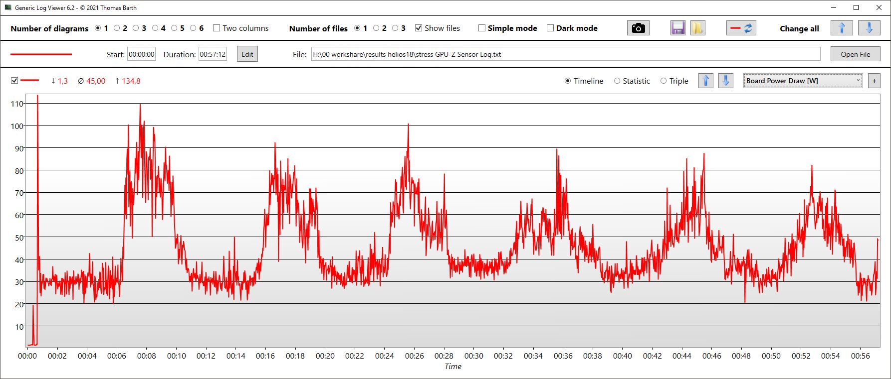 Die GPU verhält sich deutlich inkonstanter und weist eine Leistungs-Wellenkurve auf. So erreicht die Taktrate ein zyklisch wiederkehrendes Maximum von 2,5 GHz, die Kurventäler liegen bei etwa 1,2 GHz. Gleichzeitig verzeichnen wir beim sonst konstanten Speichertakt von 2,3 GHz sehr spontane Einbrüche runter auf nur 200 MHz für den Bruchteil von Sekunden. Die GPU-Temperatur schwankt ebenso, liegt im Schnitt aber nur bei 64 °C, das Maximum bei 76 °C. Dabei pendelt die Leistungsaufnahme zwischen 25 W und 90 bis 100 W.