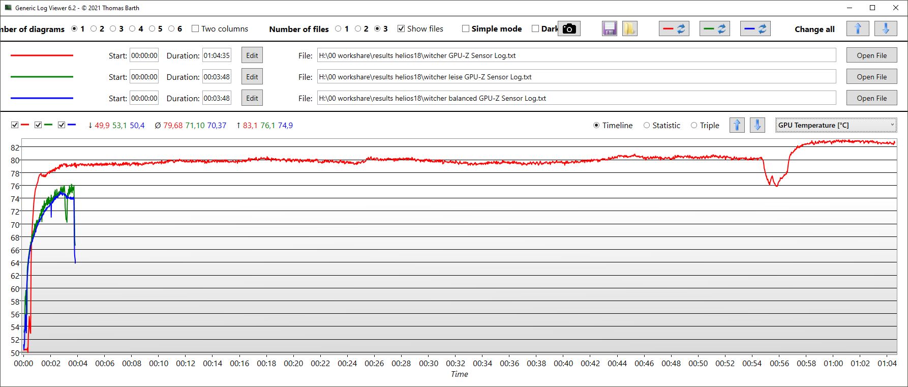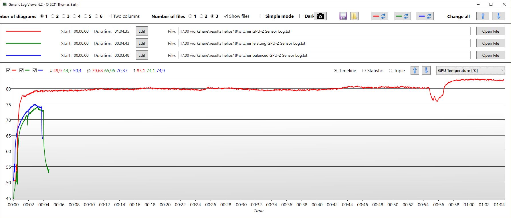 Dass laut aufdrehende Lüfter auch etwas Positives haben, sieht man bei den Oberflächentemperaturen. Das Helios 18 erwärmt sich nur sehr punktuell (Unterseite zentral und links zum Display hin), bleibt ansonsten jedoch beinahe ungewöhnlich kühl. So fühlt sich beispielsweise die linke Handballenauflage selbst nach einer Stunde Gaming geradezu kalt an. Hier zeigt sich, dass die lauten Lüfter einerseits zu aggressiv eingestellt sind und die Hitze andererseits nicht sehr gut verteilt wird.
