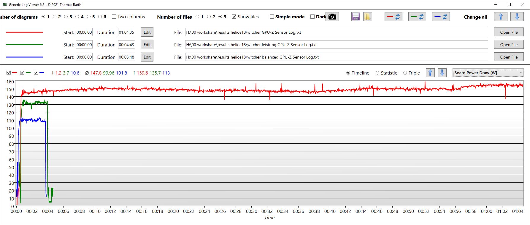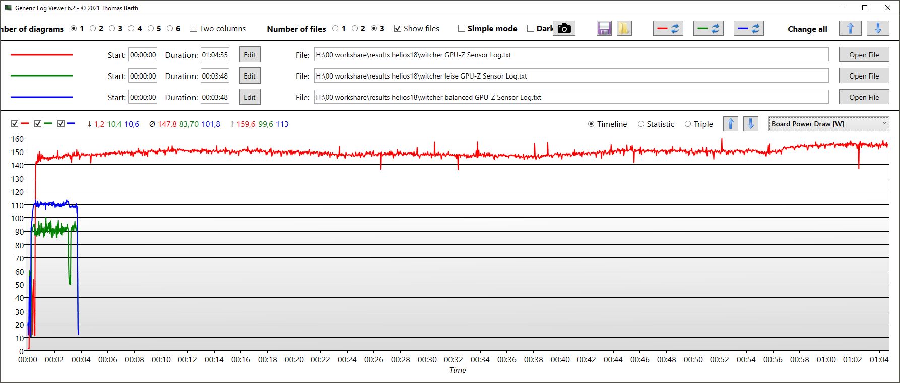 Im Wifi- und im Videotest mit auf 150 Nits reduzierter Helligkeit hält das Helios 18 etwa 4,5 bis knapp 5 Stunden durch. Das MSI ist minimal ausdauernder, das Alienware hält im WLAN-Test ähnlich lange durch.