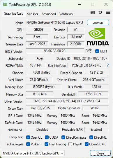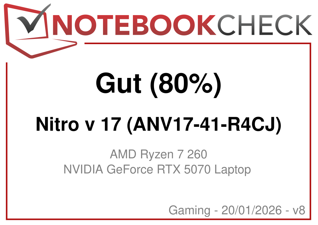 | Acer Nitro v 17 (ANV17-41-R4CJ) AMD Ryzen 7 260 ⎘ NVIDIA GeForce RTX 5070 Laptop ⎘ 16 GB RAM, 1024 GB SSD | Amazon: Bestpreis 1399€ nullprozentshop.de 2. 1399€ notebooksbilliger.de 3. 1410.76€ notebooksbilliger.at | 2.7 kg | 24 mm | 17.30" 1920x1080 127 PPI IPS | |