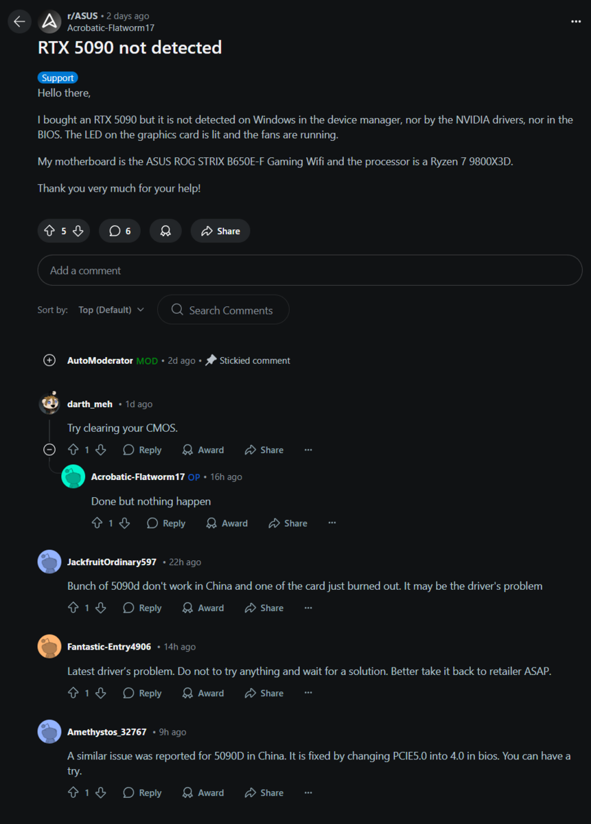 Interessanterweise sind die fehlerhaften Treiber zufolge nicht nur auf die in China erhältliche RTX 5090D beschränkt, da ein weiterer Nutzer im Subreddit von Asus behauptet, dass seine RTX 5090 weder im Gerätemanager von Windows noch im BIOS erkannt wird.