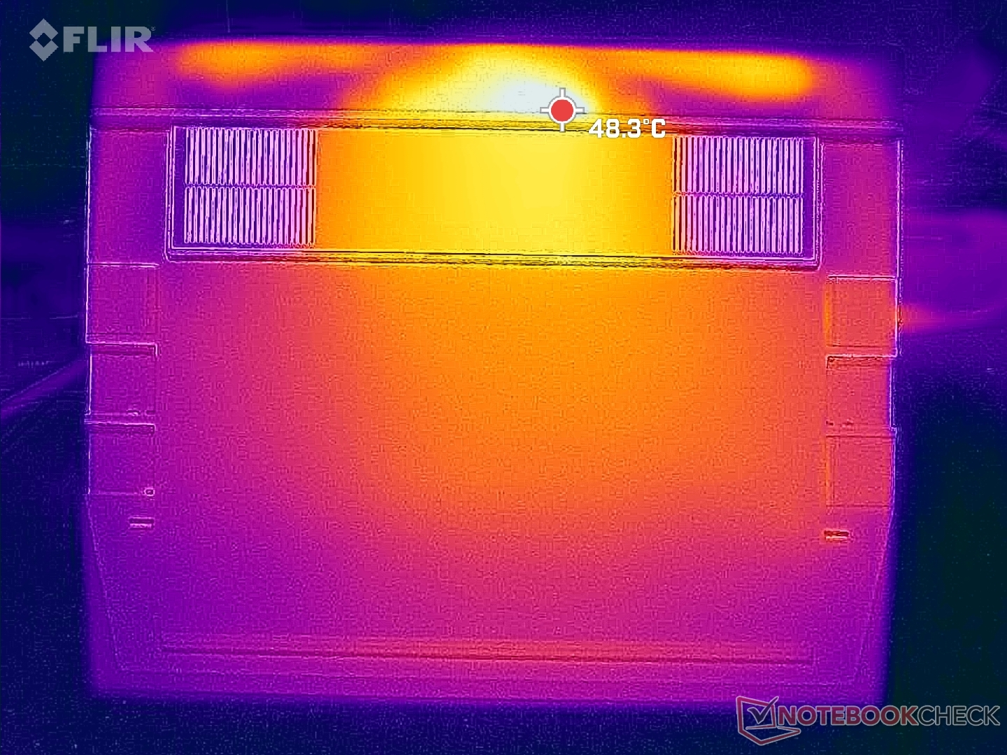 Die Oberflächentemperaturen sind aufgrund des Metallgehäuses und der lethargischen Lüfter immer warm. Bei anspruchsvolleren Aufgaben wie Spielen kann die Temperatur an der Ober- und Unterseite der Notebook-Basis über 40 °C erreichen. Die heißen Stellen befinden sich eher in der Mitte des Laptop 16, während sie bei den meisten anderen Laptops eher auf der Rückseite zu finden sind. Das bedeutet, dass man eher merkt, dass sich das Rahmensystem während der Benutzung erwärmt, im Vergleich zu einem Gerät wie dem HP Spectre x360 16, bei dem die Handballenablagen und die vorderen Bereiche eher kühler sind. Trotzdem haben wir das Laptop 16 nie als unangenehm warm auf der Haut empfunden.