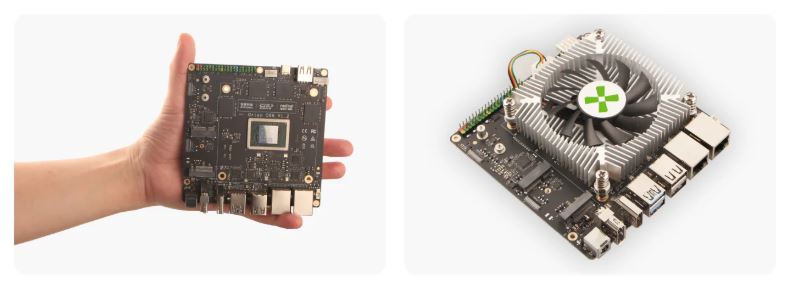 Die 120 x 120 Millimeter große Platine unterstützt die Montage eines Kühlers für den SoC und ein Lüfter lässt sich mit elektrischer Energie versorgen und auch steuern. Eine aus 40 Pins bestehende Stiftleiste zur Anbindung von Sensoren und Aktoren steht bereit. Die Platine ist etwa bei Arace schon erhältlich, für das Modell mit einem 32 Gigabyte großem Arbeitsspeicher werden rund 176 Euro aufgerufen.
