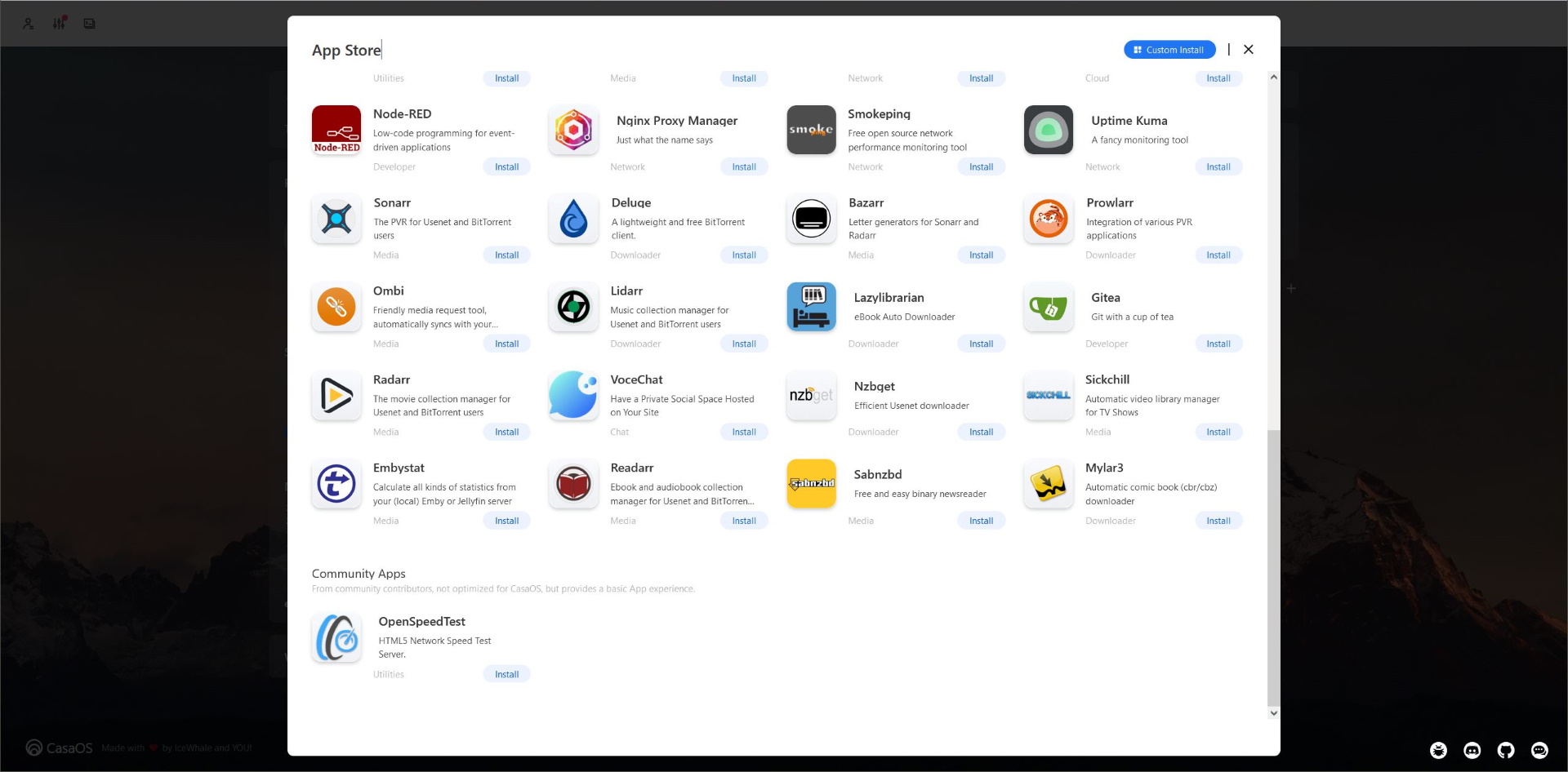 Clou der vom Zimaboard-Hersteller IceWhale entwickelten Software ist wiederum, dass sie sämtliche anderen Apps in Docker-Containern verwaltet. Über den "App Store" kann eine Vielzahl von Apps in Containern auf Knopfdruck vorkonfiguriert installiert werden, darunter bekannte Software wie Jellyfin, Proxmox, NexCloud, pfsense, OpenNAS und viele viele mehr.