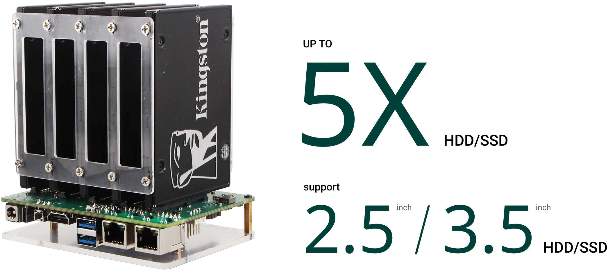Vorgesehen ist die Installation von fünf einzelnen Massenspeichern. Unterstützt werden jeweils 3,5- und 2,5-Zoll-Laufwerke. Damit ist die Montage von klassischen Magnetfestplatten, kleineren und primär aus Laptops bekannten 2,5-Zoll-Festplatten und natürlich auch SATA-SSDs möglich. Ein microSD-Kartenslot ist vorhanden, auf diesem wird dann im Regelfall das Betriebssystem installiert. Diesbezüglich ergeben sich viele Freiheiten für Nutzer, die sich selbst aber auch um die Installation und Aktualisierung des Betriebssystems kümmern müssen. Unterstützt werden die RAID-Varianten 0, 1, 5 und 10. GPIO-Anschlüsse stehen bereit. Zweimal USB 3.2 Gen 1 erlauben auch die Anbindung von externen Speichermedien.