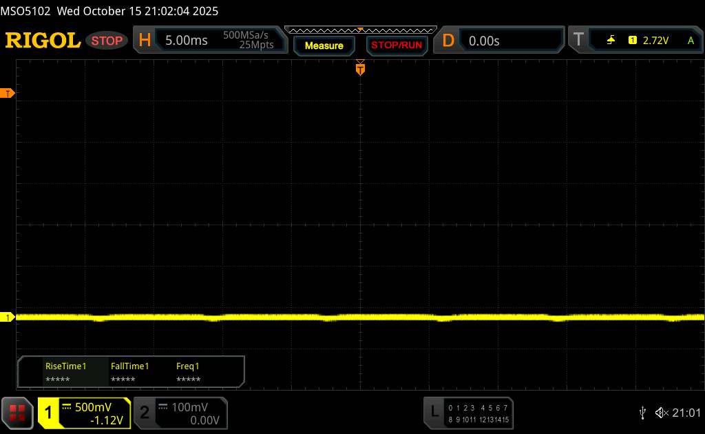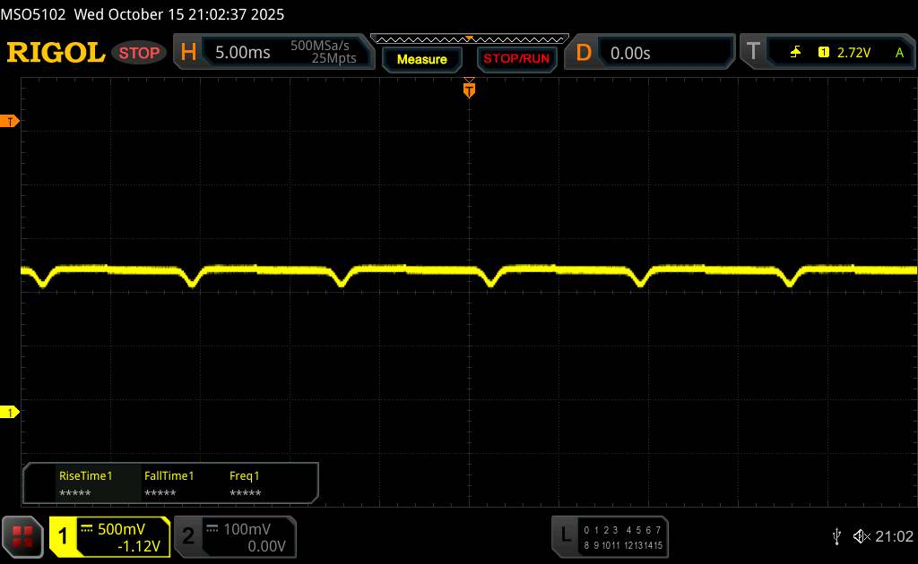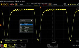 Unter dem Oszilloskop zeigt sich das typische OLED-Flackern mit einer recht geringen Grundfrequenz von 120 Hz, welche durch ein hochfrequentes PWM-Dimming sowie einen flachen Amplitudenverlauf abgemildert wird.