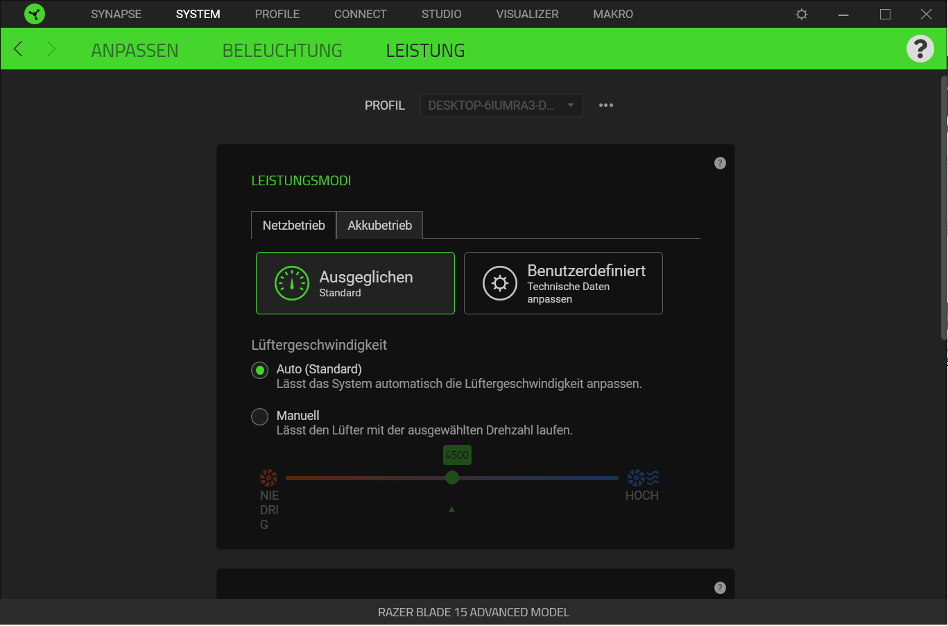 Die vorinstallierte Razer-Synapse-Software bietet Möglichkeiten zur Anpassung der Lüftersteuerung und der CPU- bzw. GPU-Leistung. Wir haben unseren Test bei automatischer Lüftersteuerung und dem Leistungsmodus "Ausgeglichen" durchgeführt.