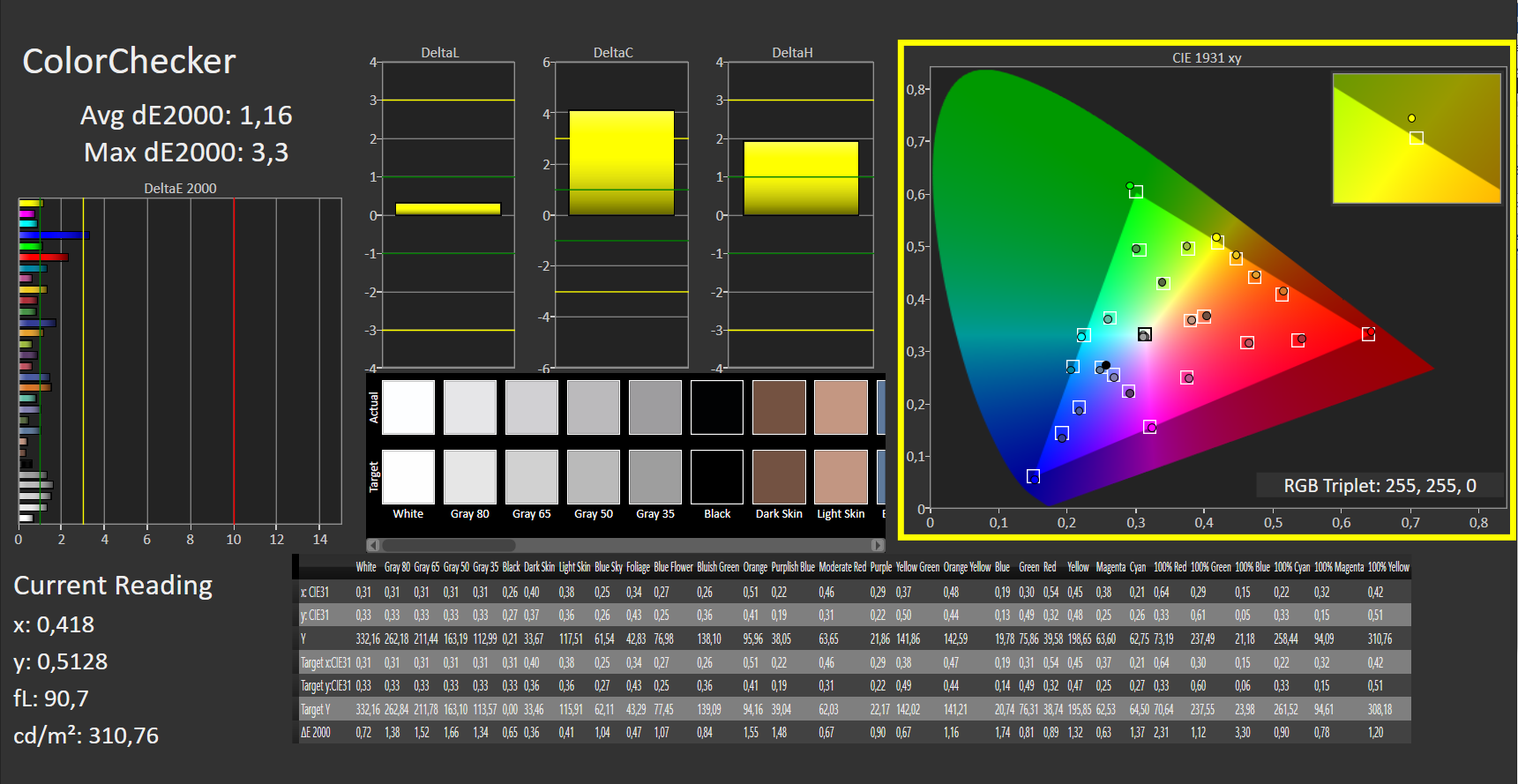 | Colorchecker dE 2000 calibrated * | 1.16 | 1.24 -7% | 2.73 -135% | 2.6 -124% | 1.77 -53% | |
