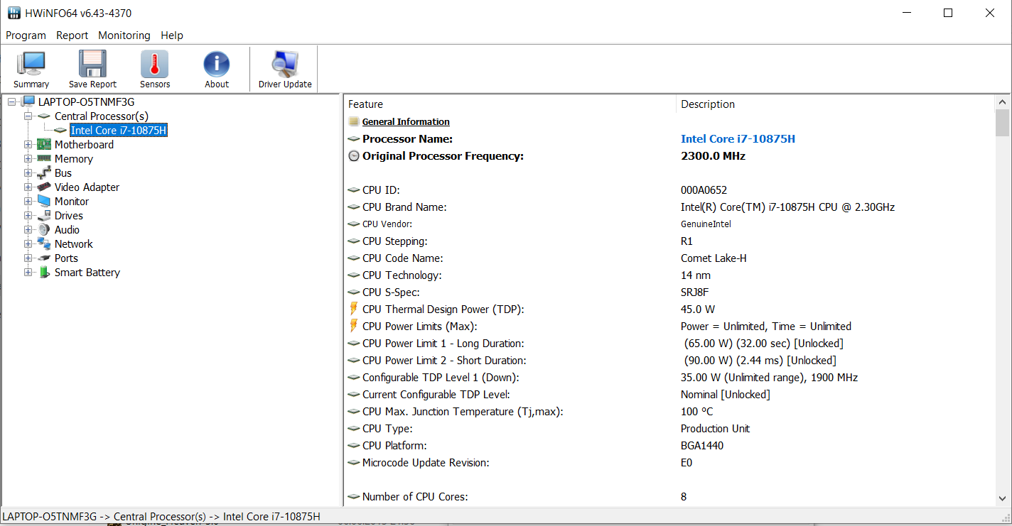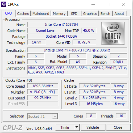 Der Core-i7-10875H-Achtkernprozessor (Comet Lake) arbeitet mit einem Basistakt von 2,3 GHz. Per Turbo ist eine Steigerung auf 4,3 GHz (acht Kerne) bis 5,1 GHz (ein Kern) möglich. Hyperthreading (zwei Threads pro Kern) wird unterstützt.