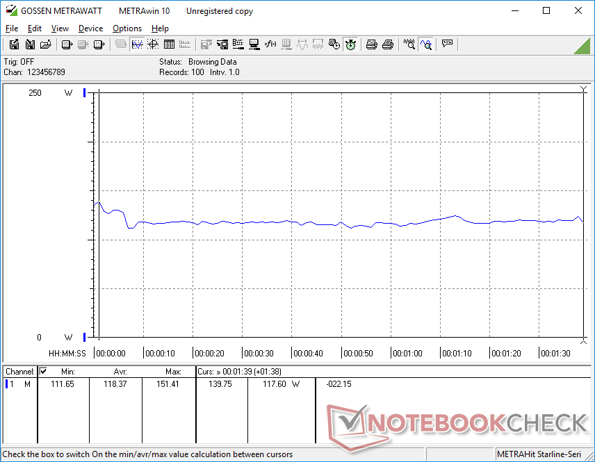 Beim Spielen liegt der Stromverbrauch bei etwa 154 W im Vergleich zu 155 W beim MSI GS66 RTX 2070 Super Max-Q oder 145 W beim MSI GS66 RTX 2080 Super Max-Q. Mit anderen Worten: Beim Sprung vom RTX 2070 Super Max-Q zum RTX 2080 Super Max-Q gibt es keinen linearen Anstieg des Stromverbrauchs im Verhältnis zur Steigerung der GPU-Leistung. Das bedeutet, dass Benutzer die Leistungsvorteile der RTX 2080 Super Max-Q genießen können, ohne dass diese notwendigerweise lauter oder wärmer läuft als eine kleinere RTX 2070 Super Max-Q-Konfiguration.