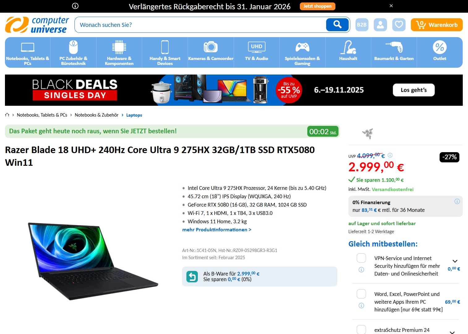 Razer hält mit der Blade-18-Reihe eine Serie von leistungsstarken Gaming-Notebooks bereit, die aufgrund ihrer Größe primär auf Schreibtischen zum Einsatz kommen dürften. Aktuell führen Computeruniverse.net und Cyberport.de einen Vertreter der Reihe zu einem Angebotspreis von 2.999 Euro in ihren Sortimenten. Ein Schwestermodell erreichte in unserem Test die Wertung „Sehr Gut (90 %)“.