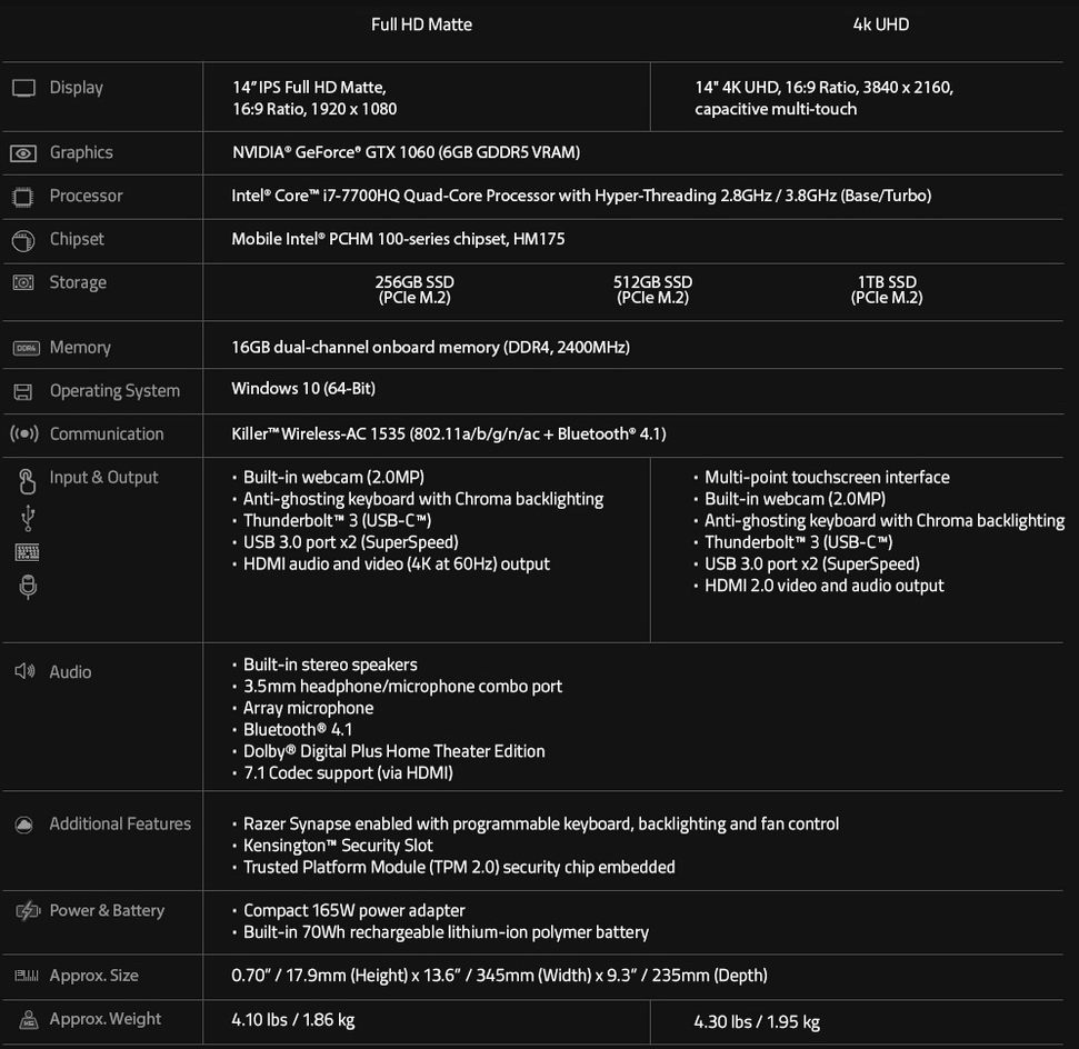 Im neuen Blade 14 arbeitet die neueste Ausgabe des Intel Core i7 Quadcore-Prozessors der siebten Generation Kaby Lake in Form des Intel Core i7-7700HQ zusammen mit der Nvidia GeForce GTX 1060 Grafikkarte. Damit ausgestattet, erreicht das schlanke Gaming-Laptop trotz der geringen Bauhöhe von etwa 18 Millimetern und einem Gewicht unter 2 Kilogramm eine vergleichsweise hohe Gaming-Performance. Durch das aus einem Stück gefräste Aluminium-Gehäuse ist das Blade 14 zudem sehr robust.