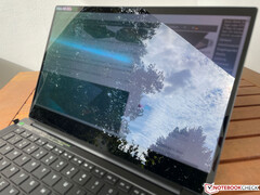 Die Blickwinkelstabilität des OLED-Touchscreens ist sehr gut, auch wenn es je nach Winkel zu leichten Verfärbungen kommt, die für OLED-Panels aber typisch sind. Durch die spiegelnde Oberfläche ist der Einsatz im Freien deutlich schwieriger als mit den matten IPS-Panel. Zudem ist die Helligkeit nicht hoch genug, um die Reflexionen kompensieren zu können. Die komfortable Nutzung ist daher nur an bewölkten Tagen möglich.