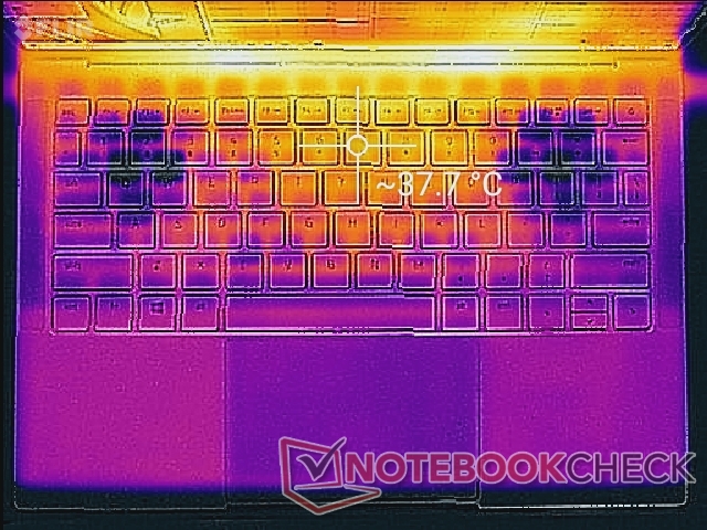 Die Oberfläche erwärmt sich etwas mehr als beim Blade Stealth auf Ice-Lake-Basis. Liegen für einen längeren Zeitraum starke Lasten an, so erwärmen sich Hotspots an der Ober- und Unterseite auf 34 °C bis 38 °C bzw. 40 °C bis 43 °C. Der Temperaturgradient ist ansonsten ähnlich symmetrisch wie beim Blade Stealth. Die Wärme ist spürbar, aber nicht störend, da die Hot Spots eher hinten liegen und von den Handballenauflagen und den meisten Tastaturtasten entfernt sind.
