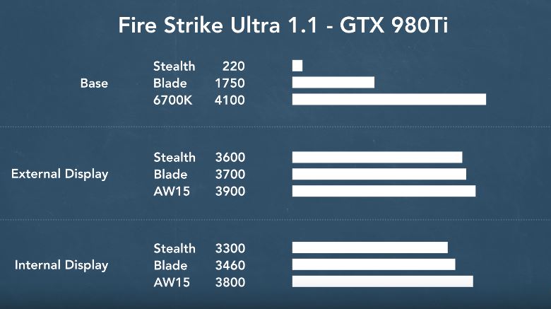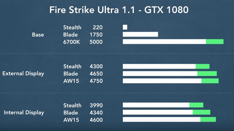 Dave beschreibt Firestrike Ultra 1.1 Benchmark-Ergebnisse einer Nvidia Gefore GTX 980 Ti und einer Nvidia Geforce GTX 1080, jeweils mit dem Razer Stealth, dem Razor Blade und einem Alienware 15 Notebook im Vergleich zu einem Desktop-Rechner. Getestet wurden einmal die Geräte selbst ohne externe Grafik, einmal mit externem Display sowie externer Grafik und einmal mit internem Notebook-Display sowie externer Grafik. Aus den Tests ergibt sich, dass die externe Grafikkarte einem Notebook ungefähr 85-90 Prozent der GPU-Leistung eines gleich konfigurierten Desktop-Rechners verschaffen kann, bei der Verwendung eines externen Displays. Wenn dagegen das interne Display des Notebooks verwendet wird, müssen die gerenderten Videodaten zurück über den Thunderbolt 3-Port und verursachen dadurch scheinbar einen leichten Performance-Einbruch. CPU-lastige Spiele wie beispielsweise das neue Doom, sind natürlich auf einem Quad-Core-Desktop-Rechner schneller als auf einem Dual-Core-Notebook. Die externe Grafik kann insbesondere Notebooks mit diskreter GPU entlasten, sodass diese weniger heiß laufen.