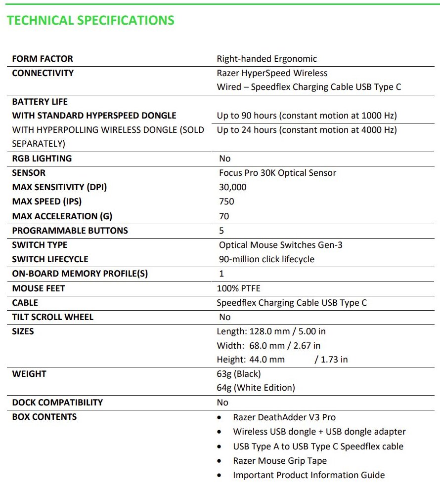 Hier die wichtigsten Daten der Razer DeathAdder V3 Pro im Überblick (Herstellerangaben):