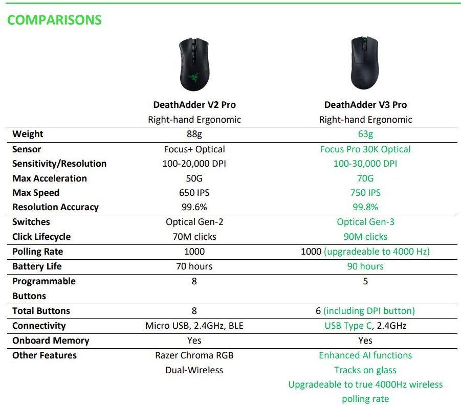 Die DeathAdder V3 Pro folgt der Viper V2 Pro und bringt auch die gleiche Technik mit. Als optischer Sensor kommt auch in der DeathAdder V3 Pro der extrem schnelle und äußerst präzise PixArt PAW3950 (Focus Pro 30K) zum Einsatz. Als weiteres technische Highlight spendiert Razer der DeathAdder V3 Pro ebenfalls die sehr robusten (90 Mio. Klicks) und schnellen (0,2 ms) optischen Mouse Switches der dritten Generation (kein Doppelklicken, keine Entprellverzögerung). Den internen Speicher der DeathAdder V3 Pro reduziert Razer auf ein Direktspeicherprofil und die Beleuchtung lässt Razer gleich ganz weg.