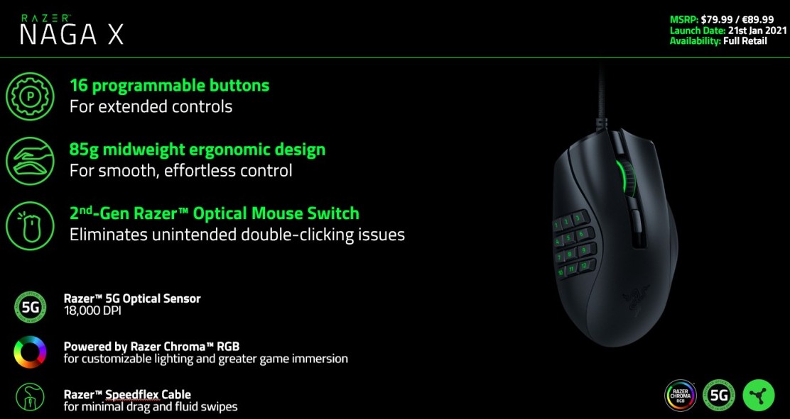 Die Razer Naga X knüpft an das bei MMO-Gamern beliebte Design der Razer Naga respektive Razer Naga Pro mit einem leichteren Formfaktor an. Dank des anpassbaren Tastenfelds lassen sich wie bei den schwereren Kalibern sehr viele Kommandos und Funktionen einfach und schnell per Fingerdruck auswählen. Insgesamt stellt die Razer Naga X satte 16 programmierbare Tasten mit einer ergonomischen Anordnung für schnellen Zugriff zur Verfügung. Jede Taste kann mit Basis-Funktionen, wie Zauber-Fähigkeiten oder komplexen Makros belegt werden.