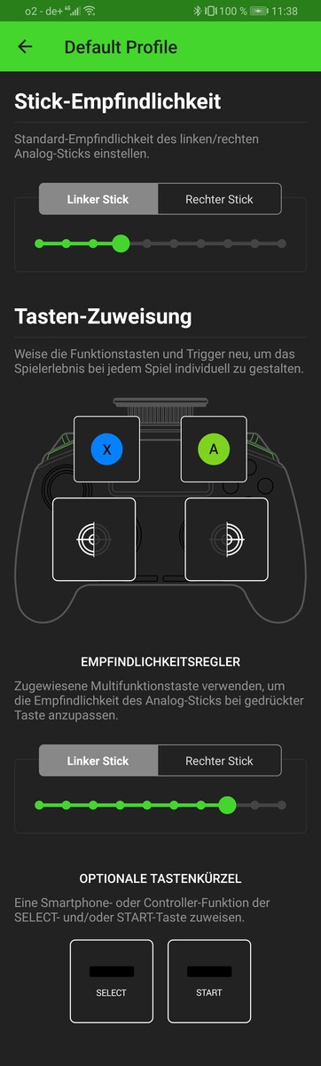 Zuweisen kann man sie über die zugehörige App aus dem Play-Store. Zwei Profile lassen sich für unterschiedliche Spiele auch ohne Registrierung speichern, für mindestens 21 Profile – soweit haben wir es ausprobiert – muss man sich auf razer.com registrieren. Über den Account kann man die Pre-Sets anschließend auch mit einem zweiten Smartphone oder dem Tablet abrufen.