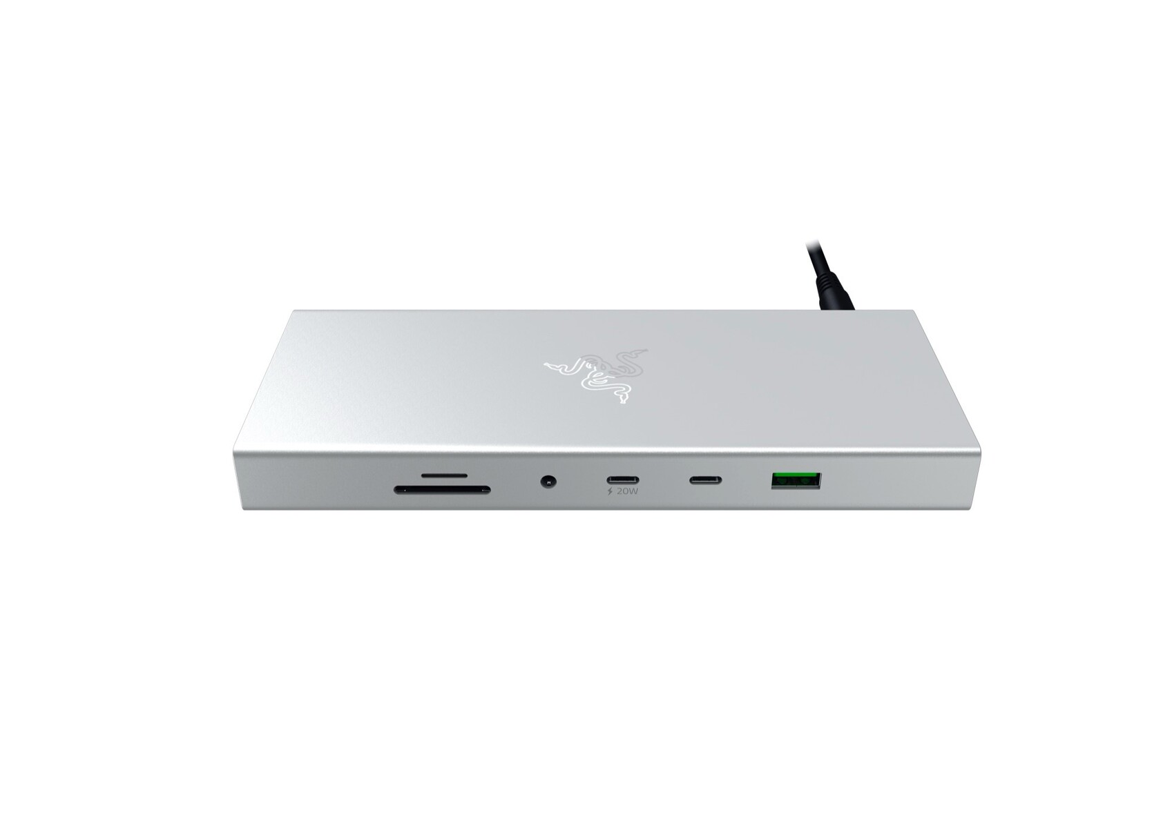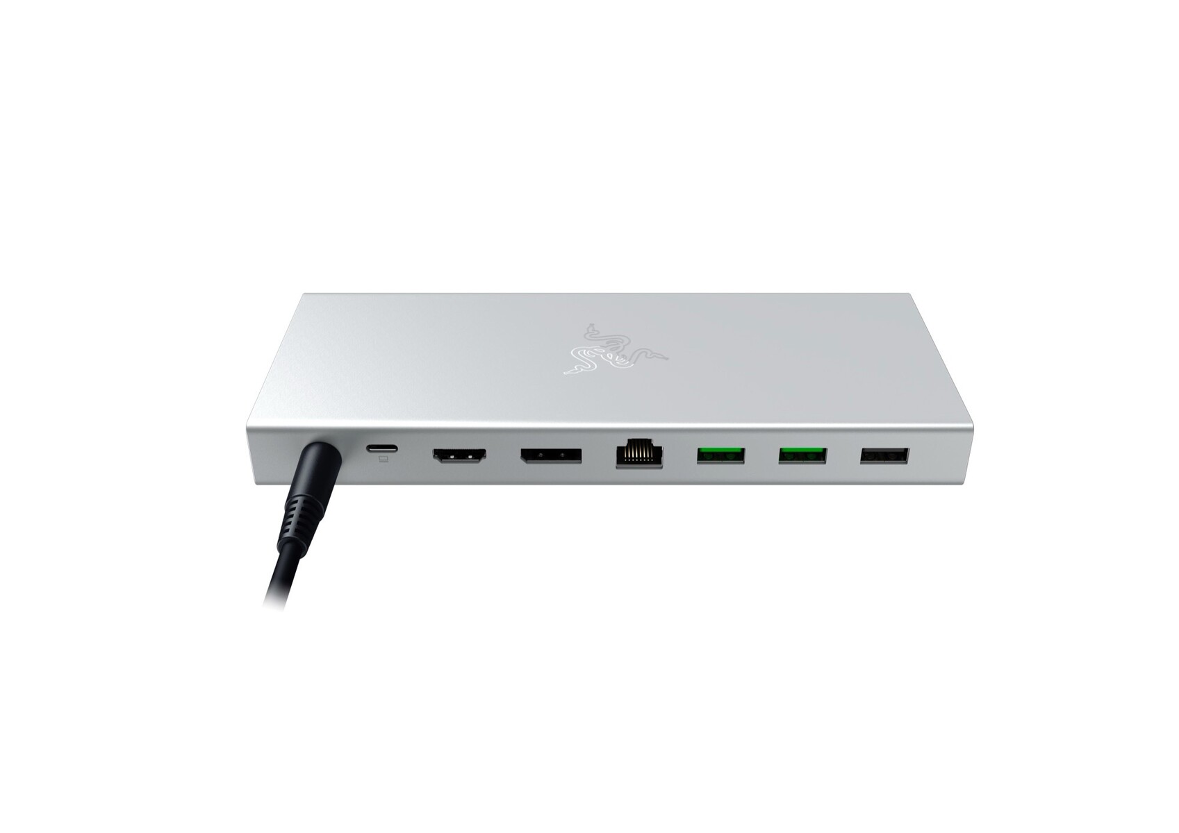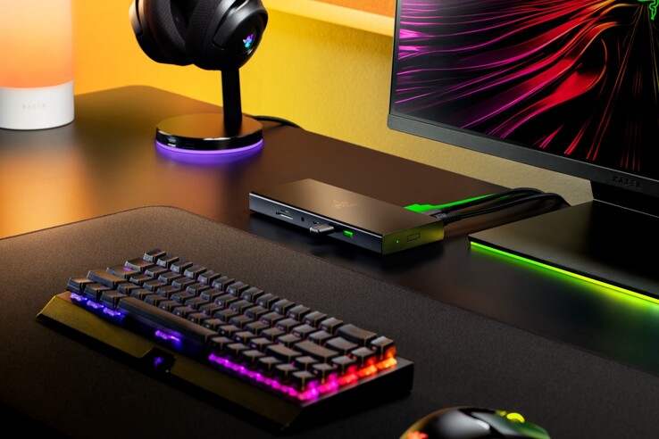 Trotz der Bezeichnung kommt USB 4 nur beim Upstream-Port zum Einsatz, die beiden Downstream-Anschlüsse erreichen "nur" Datenraten bis 10 Gbit/s, einer davon kann Geräte mit bis zu 20 Watt aufladen. Razer verbaut darüber hinaus vier USB-A-Ports, von denen zwei Datenraten bis 10 Gbit/s erreichen, zwei dagegen nur 5 Gbit/s. Durch Gigabit Ethernet kann eine verkabelte Verbindung zum Netzwerk hergestellt werden.