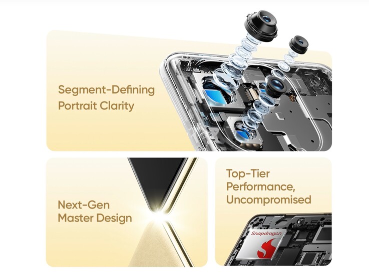 Offenbar rundet Realme sowohl das Display als auch die Rückseite auf allen vier Seiten leicht ab. Die Rückseite erhält eine Leder-Textur, und wird zumindest bei einer Version des Smartphones in Gelb ausgeführt. Realme verbaut einen noch nicht näher genannten Qualcomm Snapdragon Prozessor, der schneller als der Snapdragon 7 Gen 4 sein soll, möglicherweise verbaut Realme also den Snapdragon 8s Gen 4.