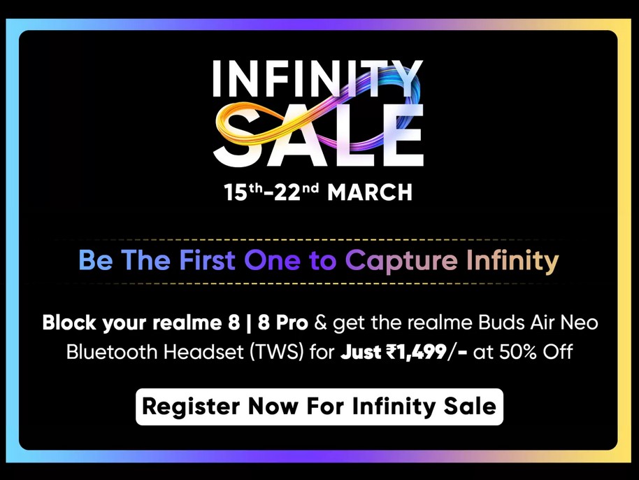 Realme launcht seine Realme 8 Smartphone-Serie zwar erst am 24. März, in Indien schlägt der Handyhersteller trotzdem schon kräftig auf die Werbetrommel. Der Pre-Sales mit großer Vorbesteller-Kampagne ist dort bereits als "Infinity Sale" eröffnet. Der Vorverkauf von Realme 8 und Realme 8 Pro wird laut dem Launch-Partner Flipkart bis zum Ende der Woche andauern.