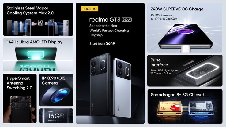 Das Realme GT 3 kommt im Mai in den Farben Booster Black und Pulse White auf den Markt. Das Basismodell mit 8 GB Arbeitsspeicher und 128 GB Flash-Speicher wird für 649 US-Dollar angeboten. Realme hat noch keine Details zu internationalen Preisen oder zur unverbindlichen Preisempfehlung der größeren Modelle bestätigt, denn das Realme GT 3 wird mit bis zu 16 GB RAM und 512 GB Flash-Speicher angeboten.