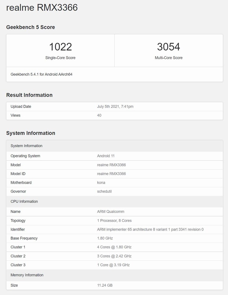 In der Benchmark-Anwendung outete sich das neue Realme Phone mit der Modellnummer RMX3366 auch mit 12 GB RAM, die laut gestrigem Leak in Europa mit 256 GB Speicher um 449 Euro starten soll, daneben dürfte es aber auch eine Version mit 8 GB RAM geben, die bereits ab 399 Euro angeboten werden soll, ob dann mit Snapdragon 778G wie von 91Mobiles behauptet oder ebenfalls mit Snapdragon 870 bleibt noch abzuwarten.
