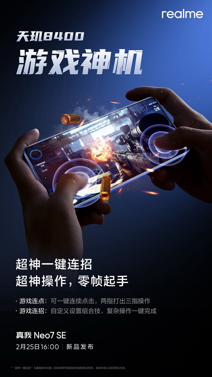 Realme hat eine Reihe von Teaser-Bildern veröffentlicht, und dabei bestätigt, dass das neue Realme Neo 7 SE am Dienstag, dem 25. Februar, offiziell vorgestellt wird. Das Mittelklasse-Smartphone wird demnach in drei Farben angeboten, wahlweise mit einer schlichten, schwarzen Rückseite, mit einer texturierten Rückseite in Silber, oder in einer blauen Version mit einer dreidimensionalen Textur.