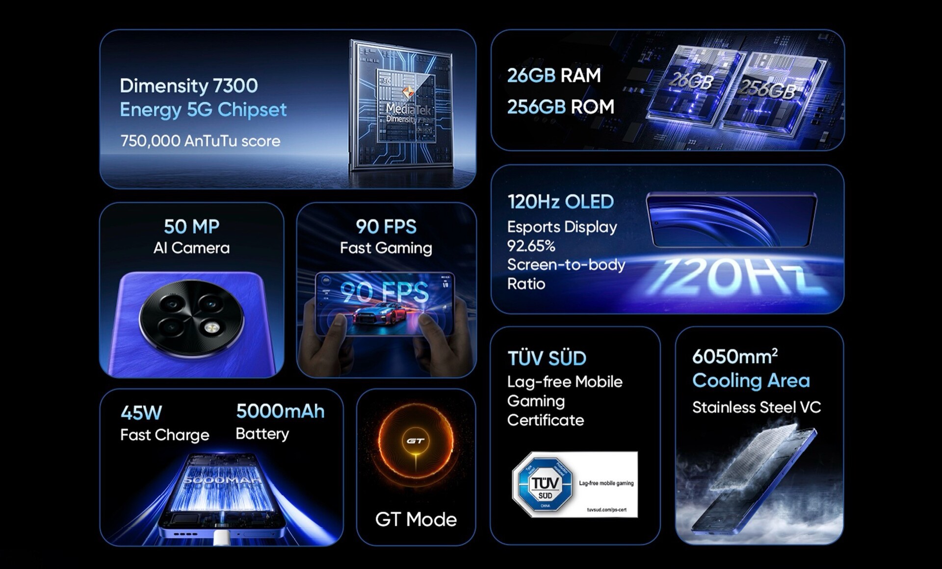 Das Realme P1 Speed 5G besitzt einen MediaTek Dimensity 7300, der vier ARM Cortex-A78 Performance-Kerne mit Boost-Taktfrequenzen bis 2,5 GHz sowie vier Cortex-A55 Effizienz-Kerne bietet. In Verbindung mit einem Kühlkörper aus Edelstahl soll das Smartphone so über 750.000 Punkte auf AnTuTu erreichen, im "GT Mode" bietet das Gerät zahlreiche Einstellungen, um die Gaming-Performance zu optimieren.