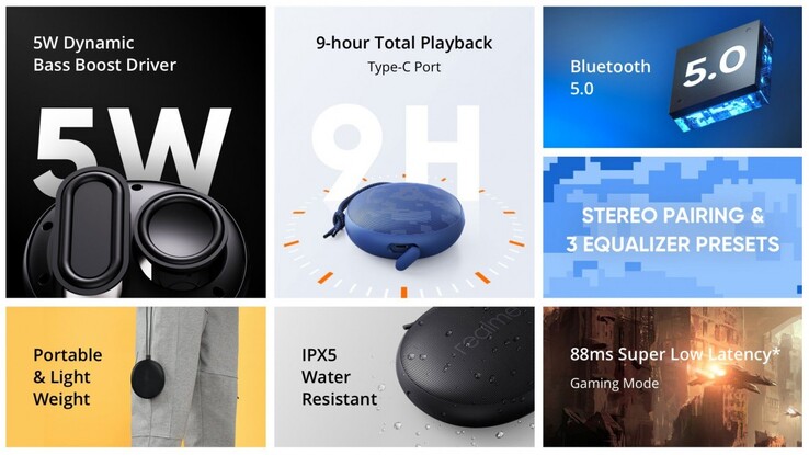 Realme verspricht, dass der Lautsprecher Frequenzen von 110 Hz bis 18 kHz wiedergeben kann. Nutzer haben die Möglichkeit, zwei dieser Lautsprecher zu einem Stereo-Paar zu verbinden, während ein Equalizer den Klang von Bass-betont auf neutral bis hell verändern kann. Die Verbindung zum Smartphone erfolgt über Bluetooth 5.0. Der 1.500 mAh fassende Akku soll 9 Stunden Musikwiedergabe schaffen, geladen wird in 2,5 Stunden über USB-C. Der Lautsprecher wiegt 200 Gramm.