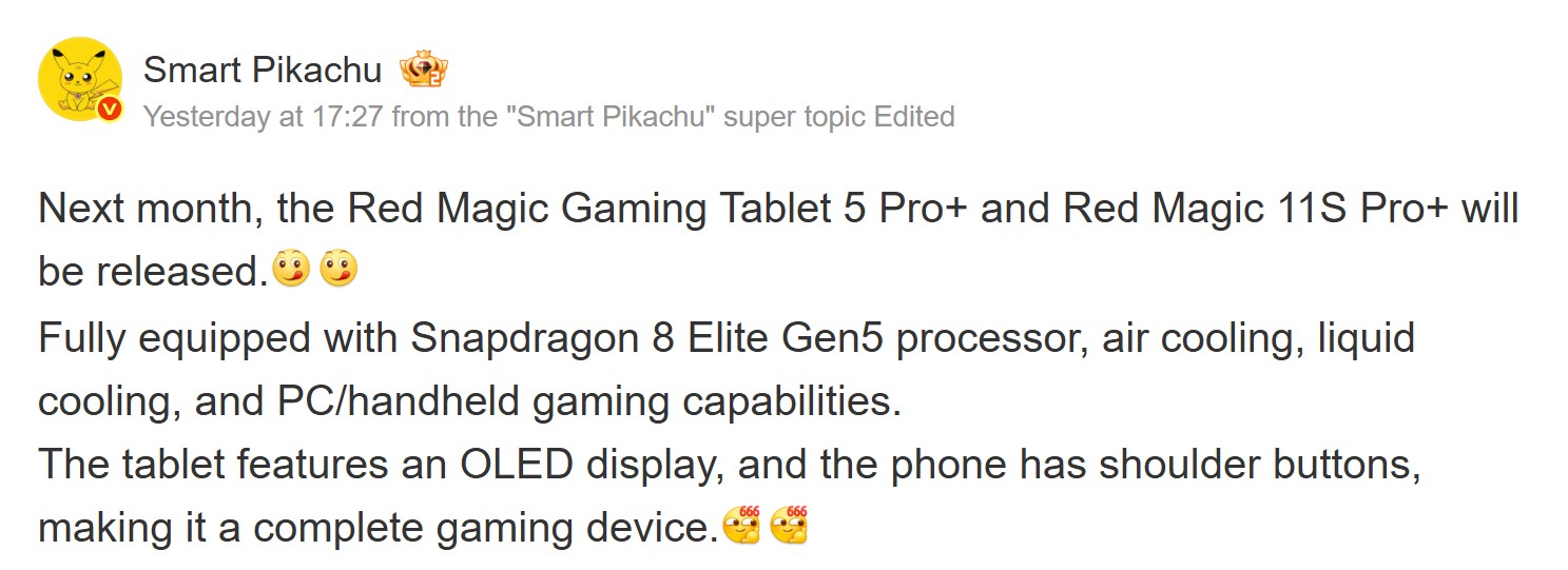Nun deutet ein neuer Bericht des bekannten Leakers Smart Pikachu darauf hin, dass das Gaming-Tablet kurz vor der Vorstellung steht. Es soll im Mai 2026 auf den Markt kommen, und RedMagic bringt seine Produkte üblicherweise kurz nach dem China-Debüt auch international heraus.
