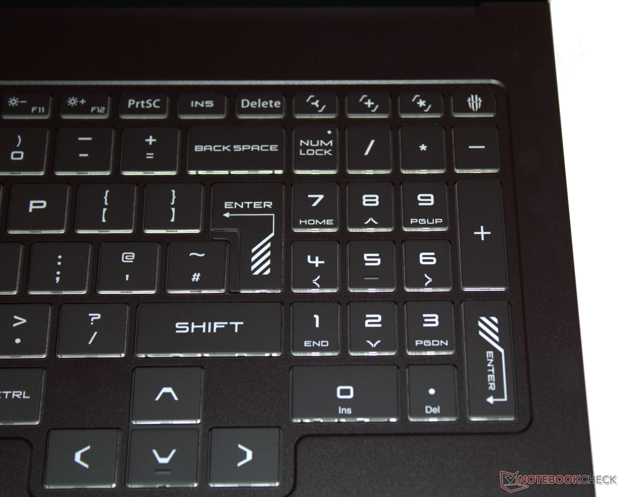 Nubia setzt auf eine Chiclet-Tastatur samt Nummernblock. Ihre eben gestalteten Tasten bieten einen kurzen Hub und einen deutlichen Druckpunkt. Während des Tippens gibt die Tastatur nicht nach. Gut: Die abgesetzten Pfeiltasten liegen in normaler Größe vor. Die RGB-Beleuchtung ist in vier Zonen unterteilt. Das Testgerät verfügt über ein QWERTY-Tastenlayout. Ob lokalisierte Layouts zu haben sind, können wir nicht sagen.
