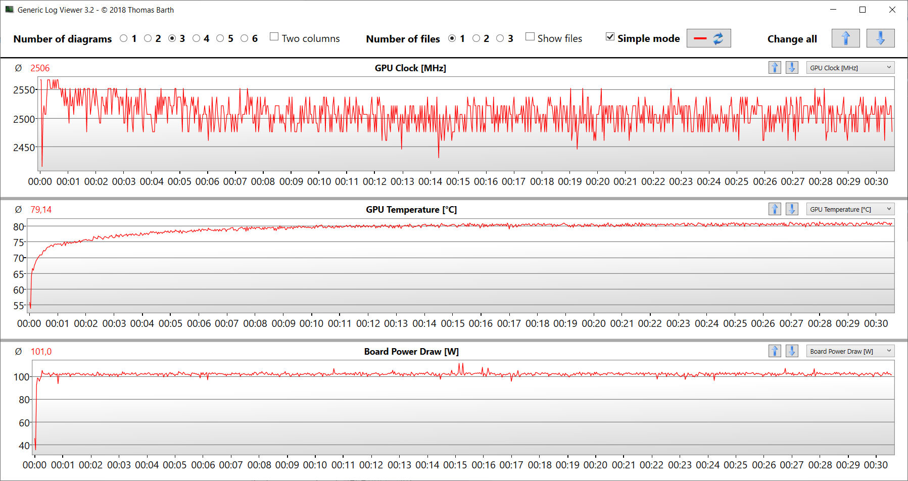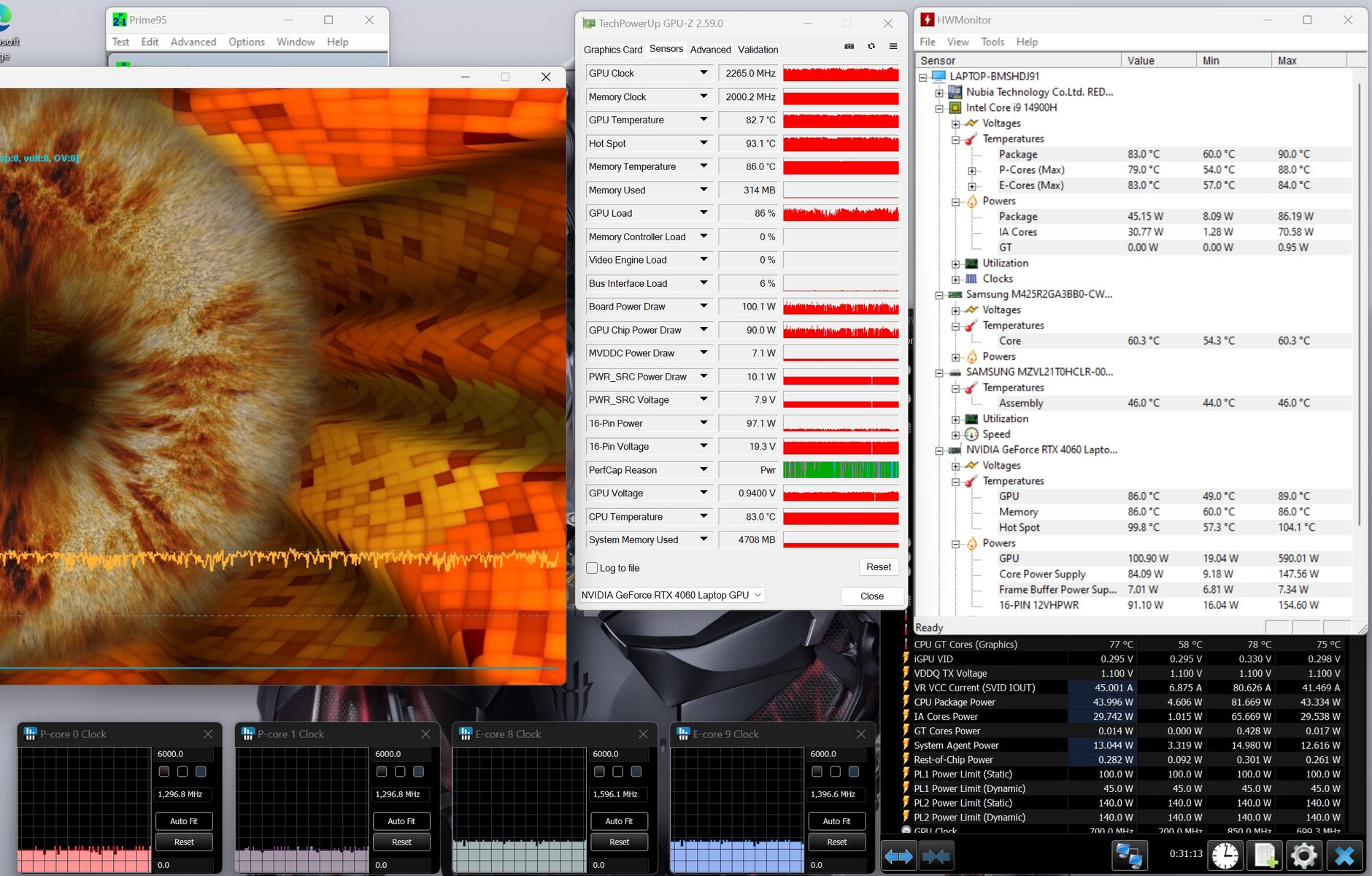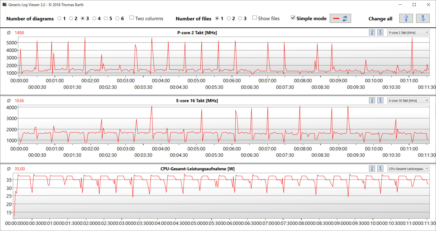 Das Extremszenario Stresstest (Prime95 und Furmark im Dauerbetrieb) überprüft die Systemstabilität unter Volllast. Die CPU arbeitet zu Beginn des Tests mit hohen Taktraten, wird dann aber auf Werte unterhalb von 2 GHz gedrosselt. Die GPU geht mit voller Kraft zu Werke.