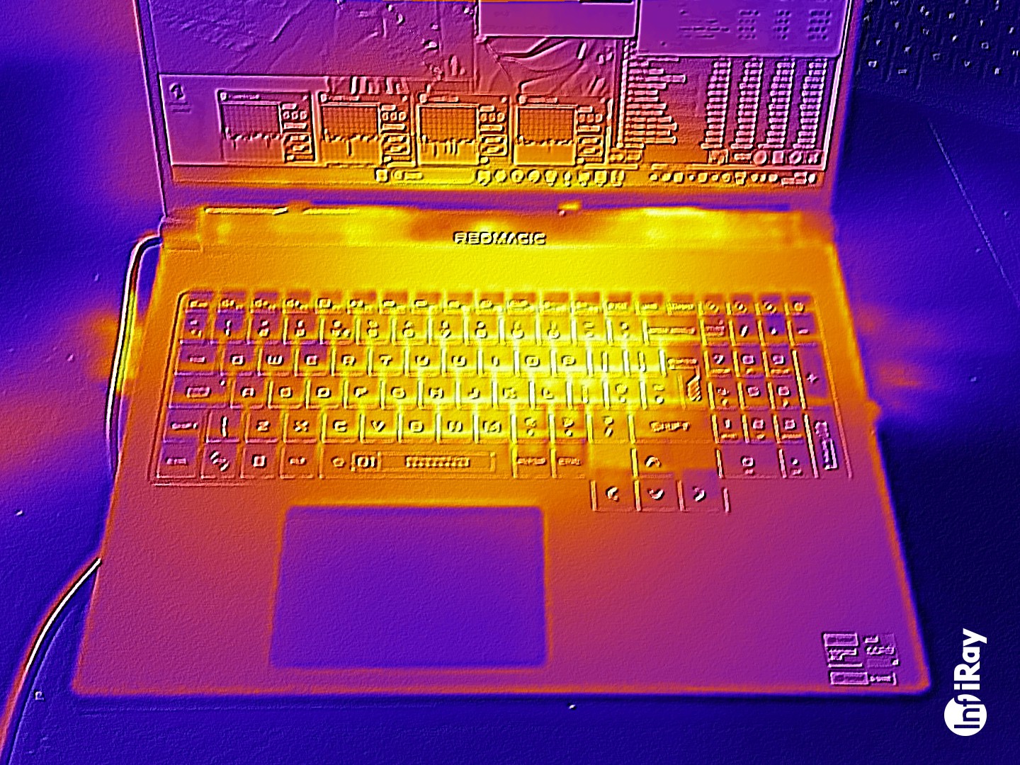 Unter Last erwärmt sich das Notebook deutlich: Cyberpunk 2077 und Stresstest sorgen punktuell für Temperaturen oberhalb von 50 Grad Celsius. Die Werte der Handablage bewegen sich teilweise im grenzwertigen Bereich. Auch im Leerlauf werden Werte jenseits des Durchschnitts erreicht.