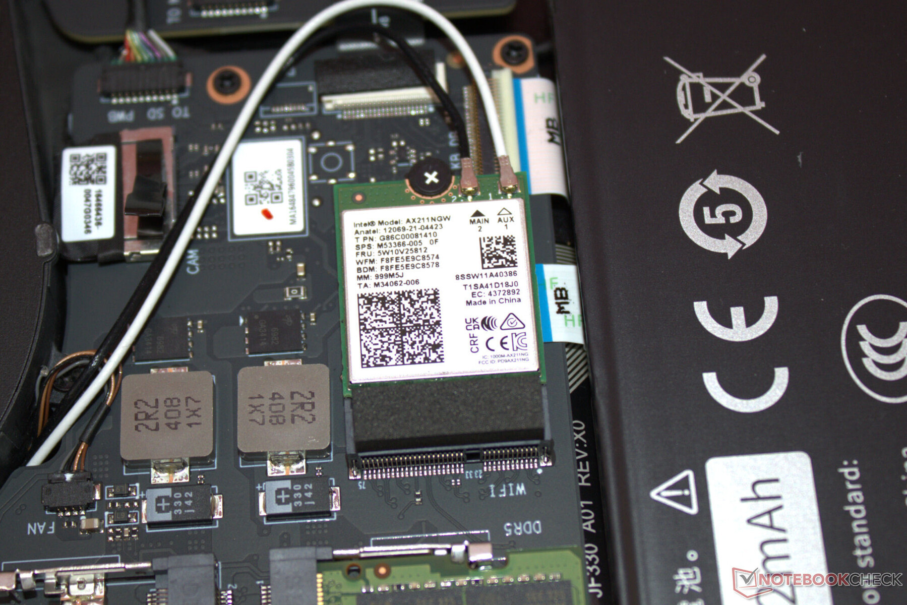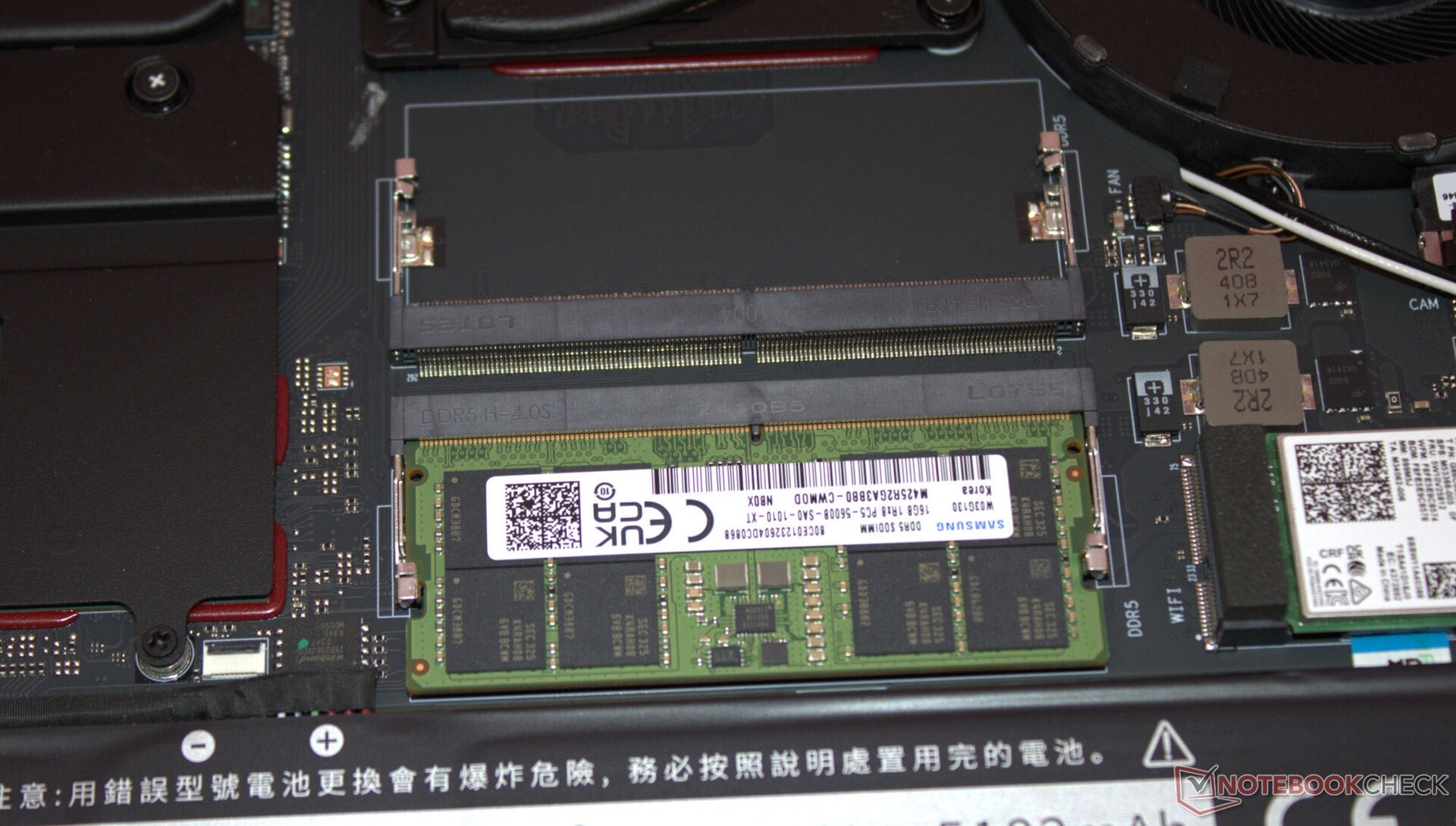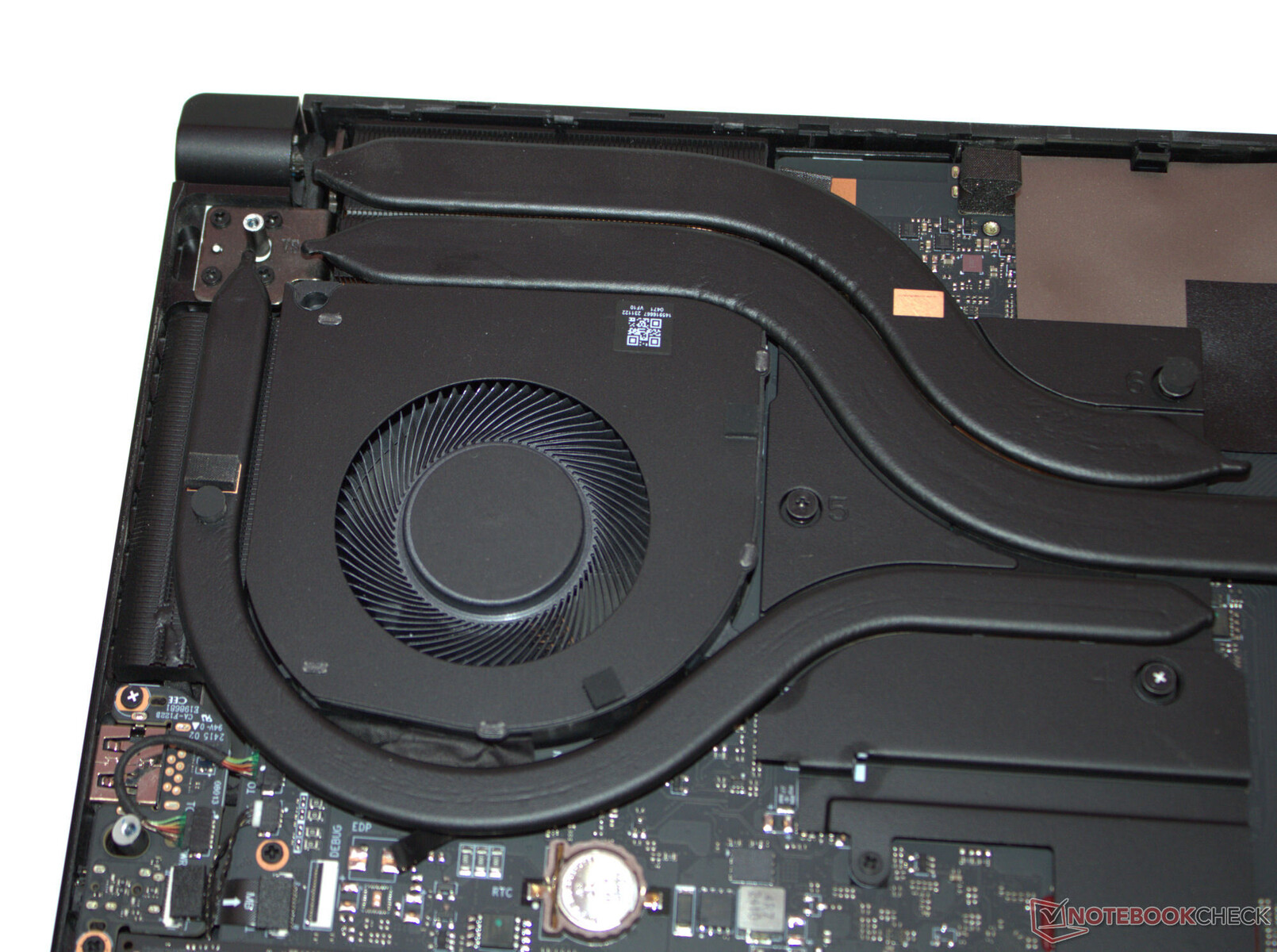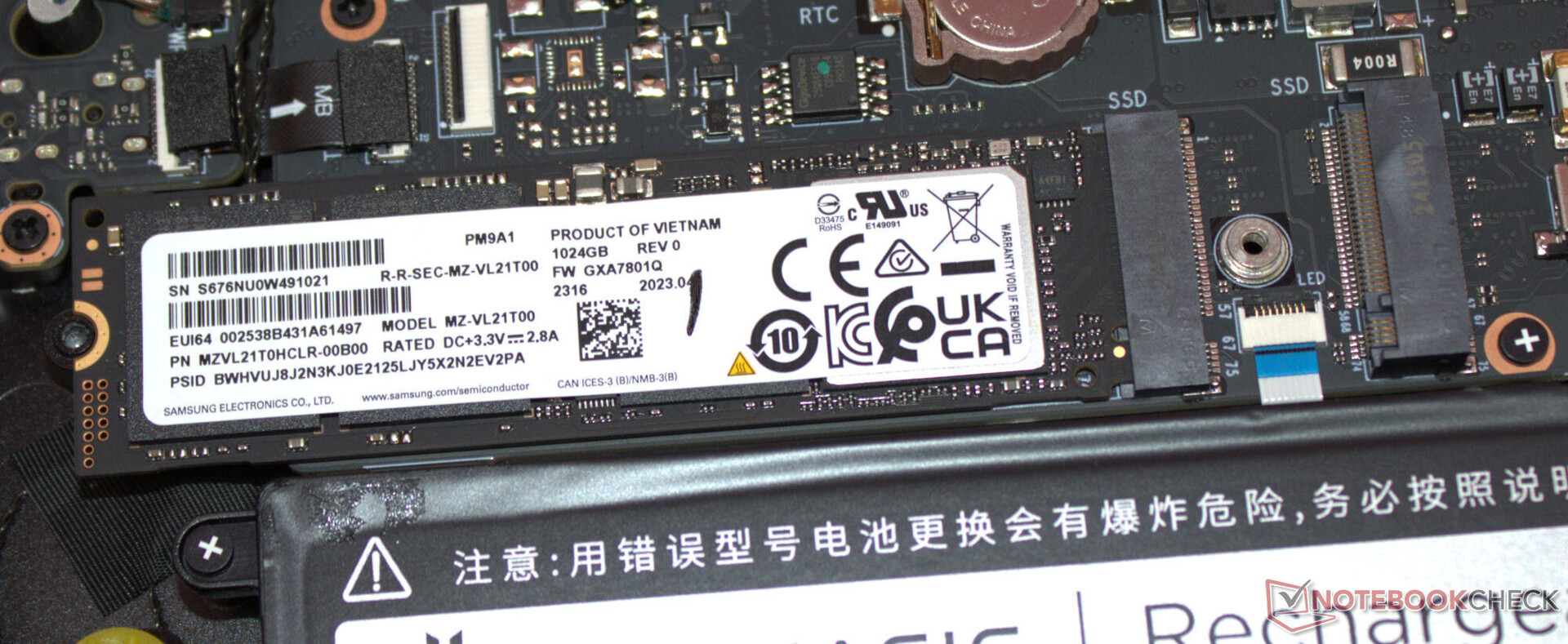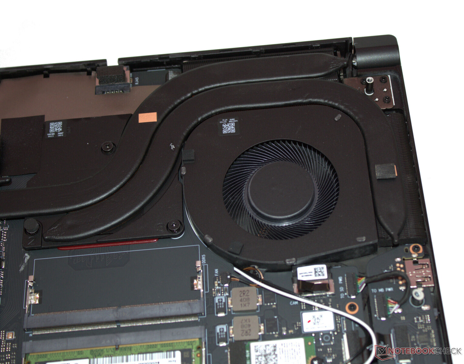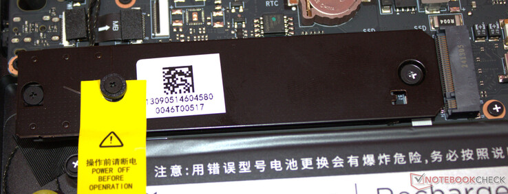 Nach Entfernung aller Schrauben auf der Geräteunterseite kann die Unterschale mittels eines Plektrums oder eines flachen Spatels abgelöst werden. Es besteht dann Zugriff auf die Speicherbänke (eine Bank belegt), die SSD (PCIe 4, M.2-2280) sowie den zweiten SSD-Slot (PCIe 4, M.2-2280), das WLAN-Modul, die BIOS-Batterie, die Lüfter und den Akku.