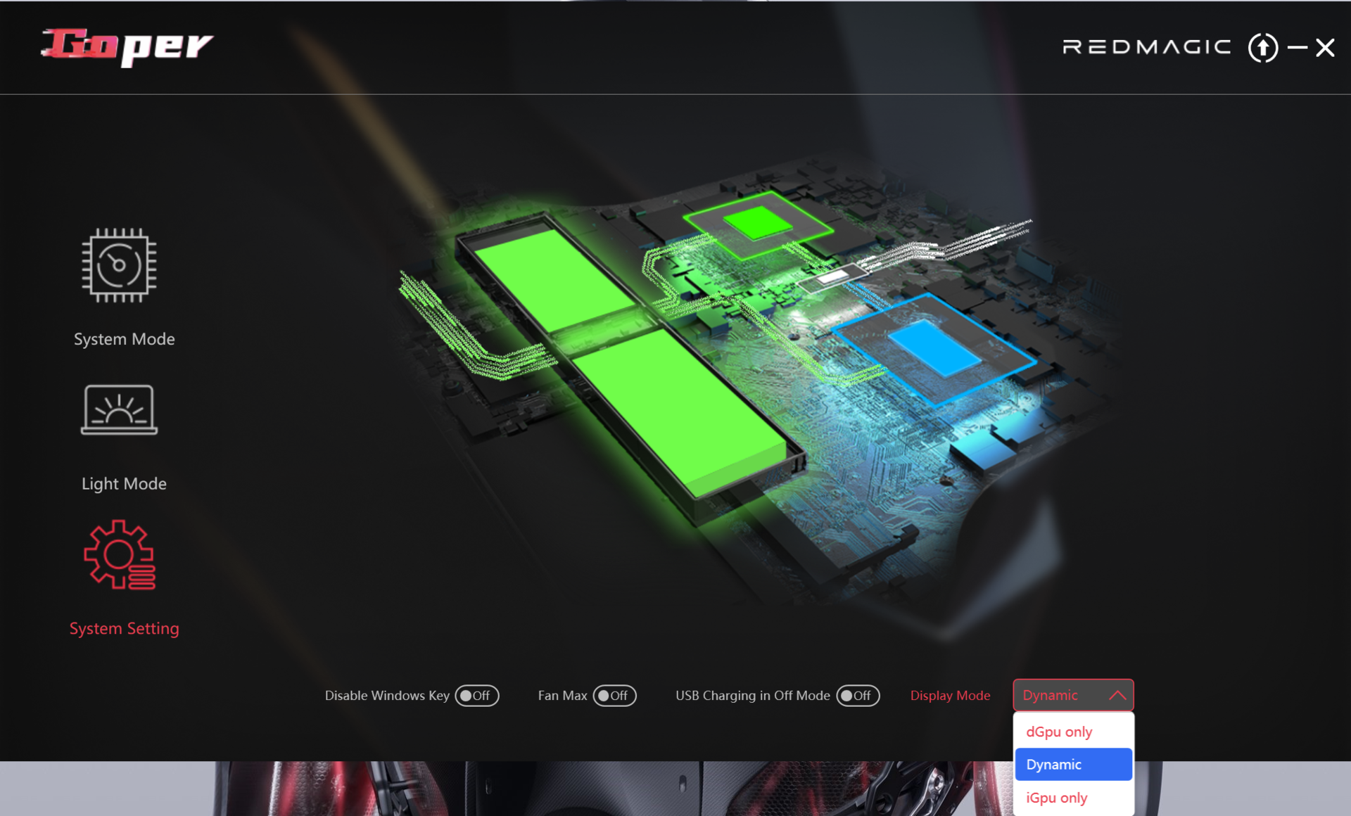Für farbliche Vielfalt in dem schwarzen Einerlei sorgen neben der Tastenbeleuchtung zwei LED-Elemente: Der RedMagic-Schriftzug auf der Scharnierabdeckung und das Logo auf dem Deckel strahlen in den Farben des Regenbogens. Alle Elemente können individuell angesteuert werden. Der Schriftzug dient zudem als Akkuleuchte: Ein rotes Blinken zeigt einen niedrigen Ladestand an.