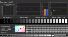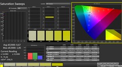 Das Panel bildet die Farbräume sRGB und DCI-P3 komplett bzw. nahezu komplett ab, den AdobeRGB-Raum nicht - das sieht bei den Bildschirmen der meisten Konkurrenten ähnlich aus. Die ab Werk ordentliche Farbdarstellung kann mittels Kalibrierung in den sehr guten Bereich gesteigert werden: Die Farbabweichung sinkt von 3,19 auf 0,69 (Soll: DeltaE < 3). Gleichzeitig werden die Graustufen deutlich ausgewogener dargestellt.