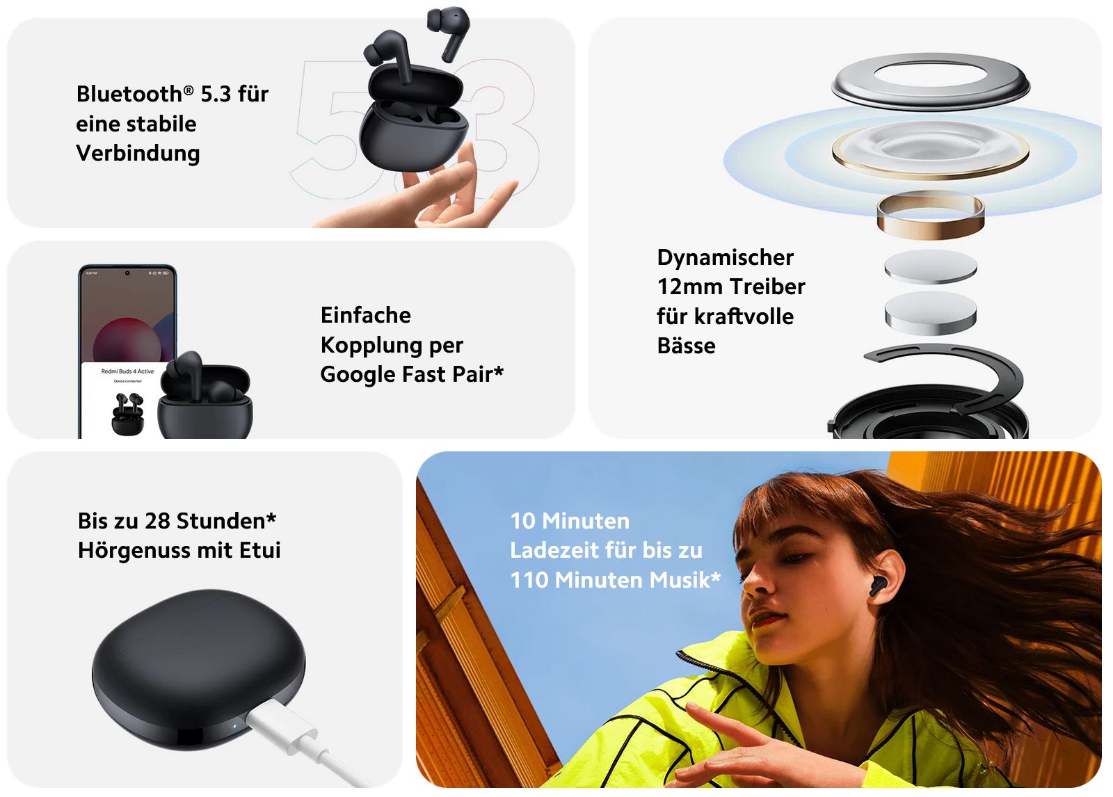 Entsprechend dem Preis von unter 30 Euro darf man von den Xiaomi Redmi Buds 4 Active als noch günstigeren Ableger der Redmi Buds 4 sowie der Redmi Buds 4 Lite natürlich keine gehobene Ausstattung erwarten. Premium-Features wie ANC (Active Noice Cancelling) gibt es hier nicht. Aber immerhin eine Geräuschunterdrückung bei Anrufen, welche über je ein Mikrofon pro Ohrhörer Störungen durch Hintergrundgeräusche unterbinden und für optimale Sprachverständlichkeit sorgen soll, ist an Bord.